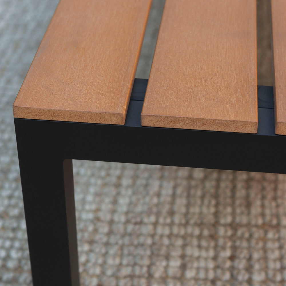 Elevate your next summer BBQ with this four piece patio conversation set. This modern piece fits all contemporary styles. Dress up its coastal flair with blue throw pillows or keep it chic and glam. Fabric seat loops allow for the UV resistant cushions to be removed and cleaned. Cast aluminum framing with unique, polysynthetic wood accents means this patio chat set is made to last, so enjoy picturing the rest of your stunning summer nights in style. And did we mention it comes with a coffee table?