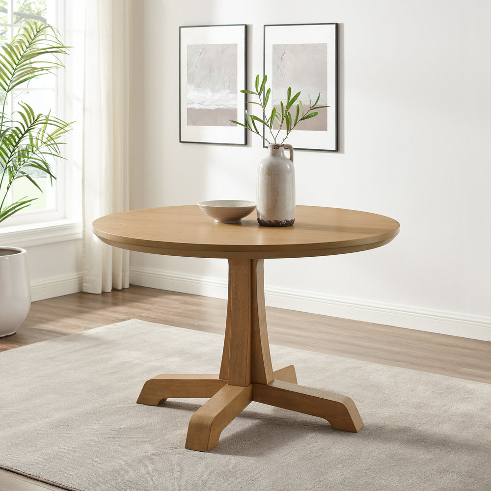 Simple. Sleek. Sturdy enough to accommodate memorable meals and game nights. With this round dining table, your space will seamlessly come together, whether its sitting in your kitchen, dining room, or even your home office. Its solid rubberwood pedestal base lends a durable and trendy foundation for the simple yet stunning engineered wood tabletop with a painted veneer finish. Whether you’re using its spacious surface to host, entertain, or tackle your next work-from-home project, this dining table is a homey refuge for any and everything.