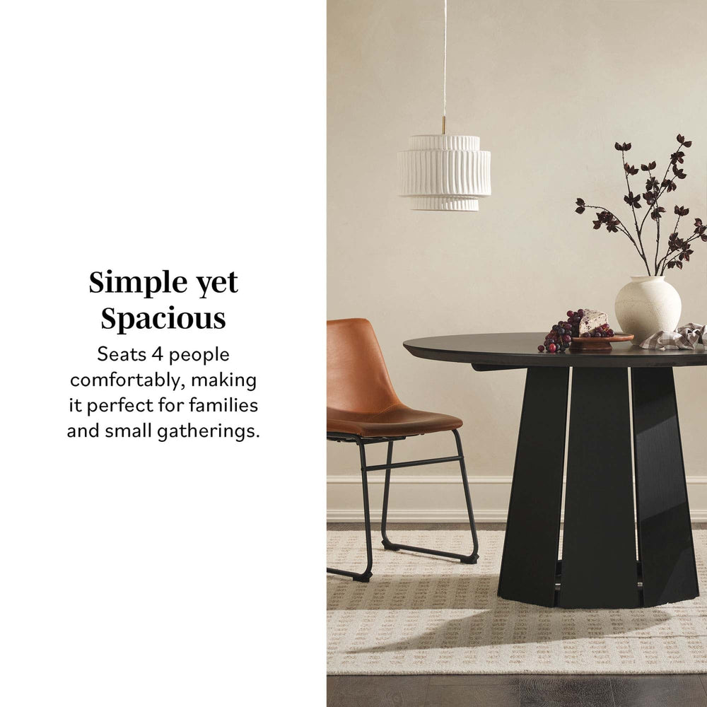 This 48-inch round dining table is the perfect statement-making piece for your kitchen or dining room. Made from solid wood sourced from renewable forests, it stands up to everyday wear and brings a touch of the nature into your home. The round tabletop design style gives you more elbow room while dining. It comfortably seats up to four people, with plenty of room leftover for your dishes, snacks, and dΓ©cor. The unique paneled wood pedestal base gives the design an elevated twist that stands out every time you're at the table. Whether you bring this table to your breakfast nook, kitchen, or dining room, you'll love its perfect balance of aesthetics and functionality.