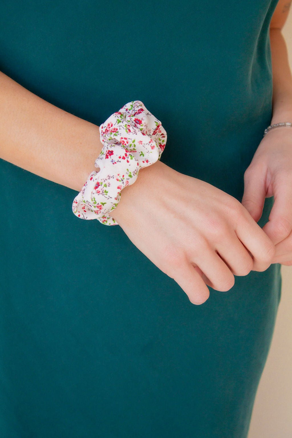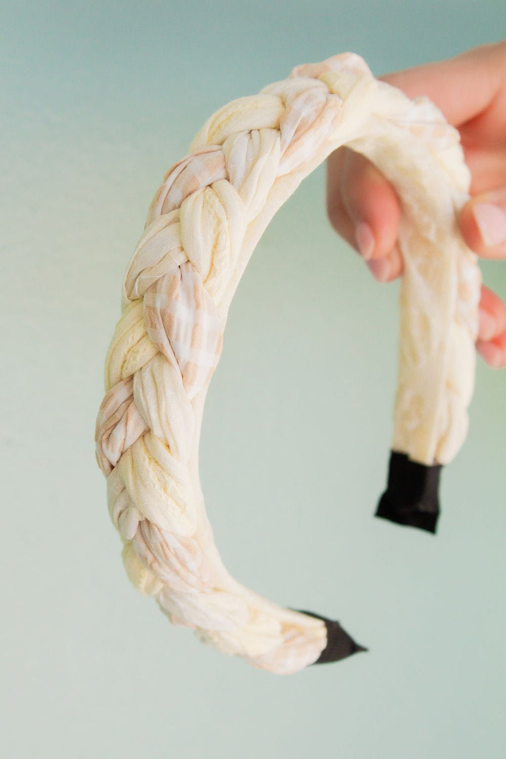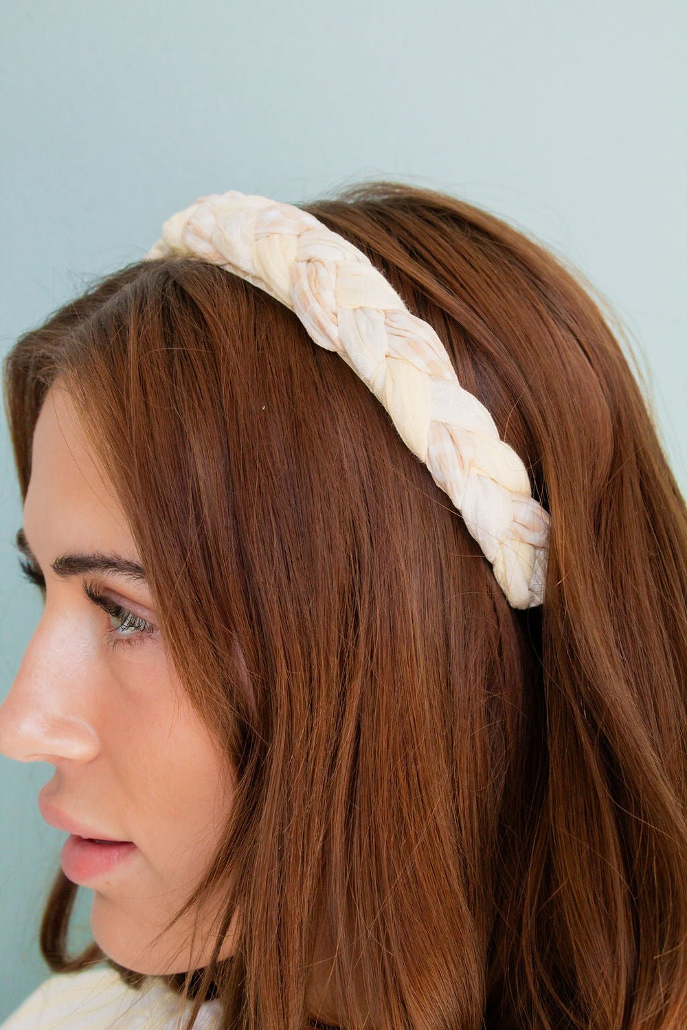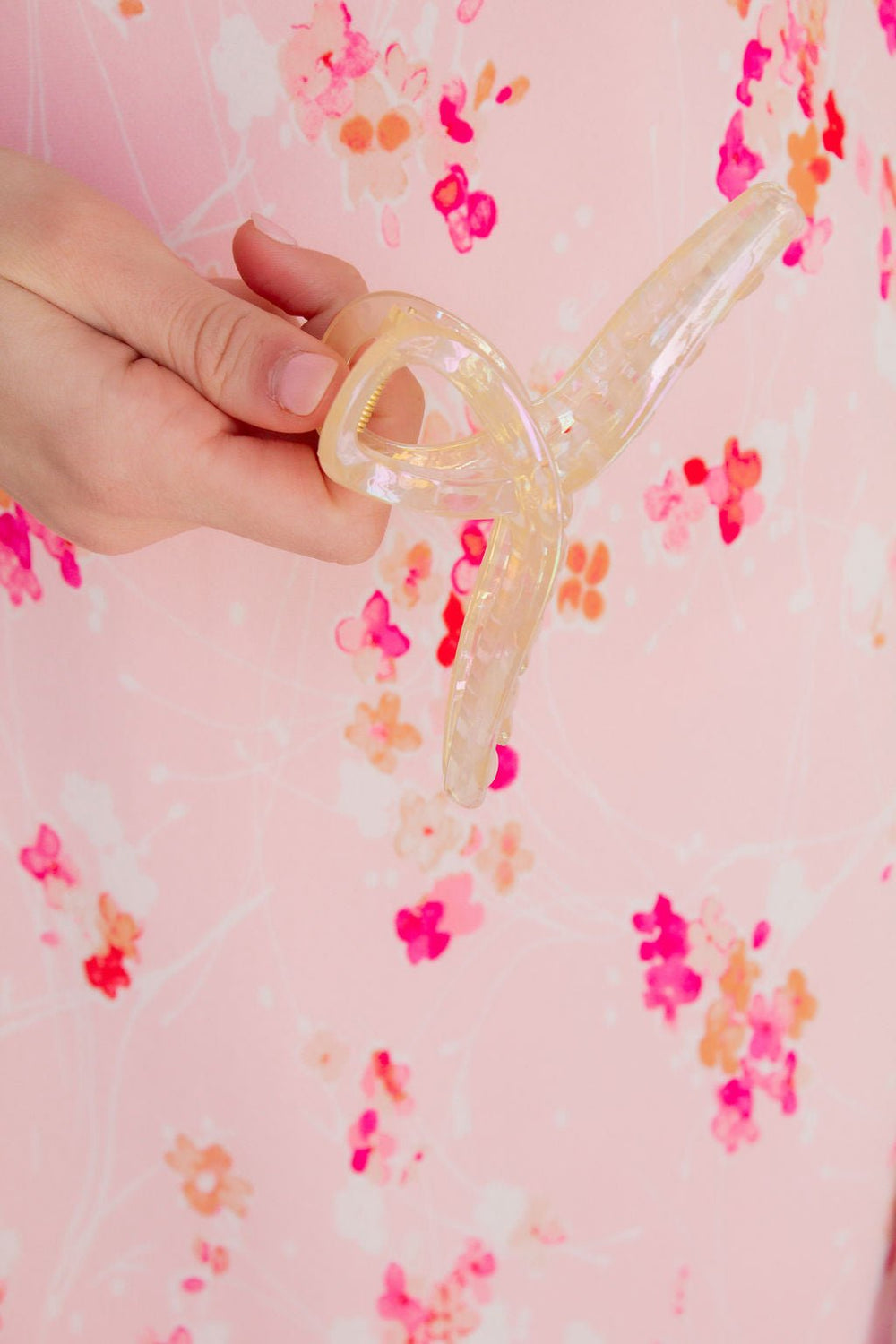 Included: a beautiful sheer and shimmery bow, an oversized floral scrunchie, a large, iridescent loop claw clip, and a beautiful braided hard headband featuring a cream and light yellow combo.