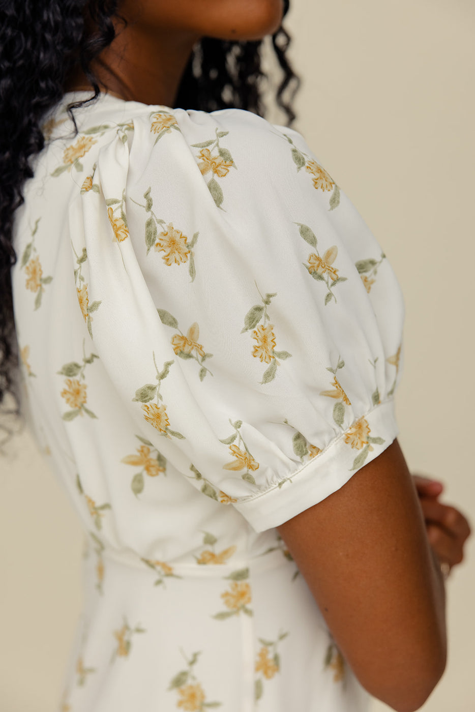 This ivory midi dress with yellow florals is effortlessly elegant and full of thoughtful details. It features a flattering silhouette with a back slit for movement, a hidden zipper closure, and delicate covered buttons that are functional above the waist. Fully lined for comfort, it's perfect for brunches, showers, or sunny day strolls.