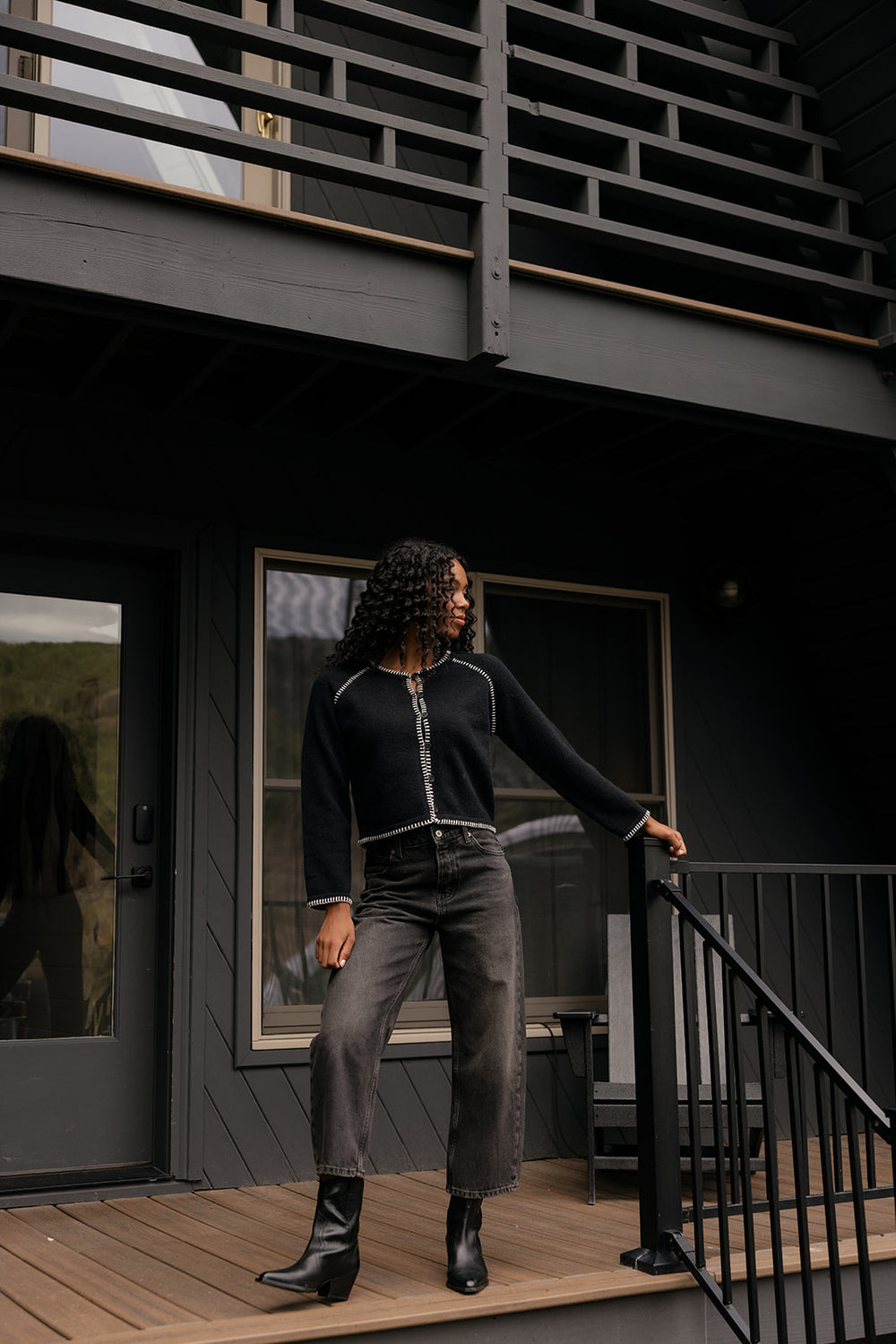 An elevated black cardigan with chic contrast trim. Its polished details and versatile fit make it perfect for dressing up or down.