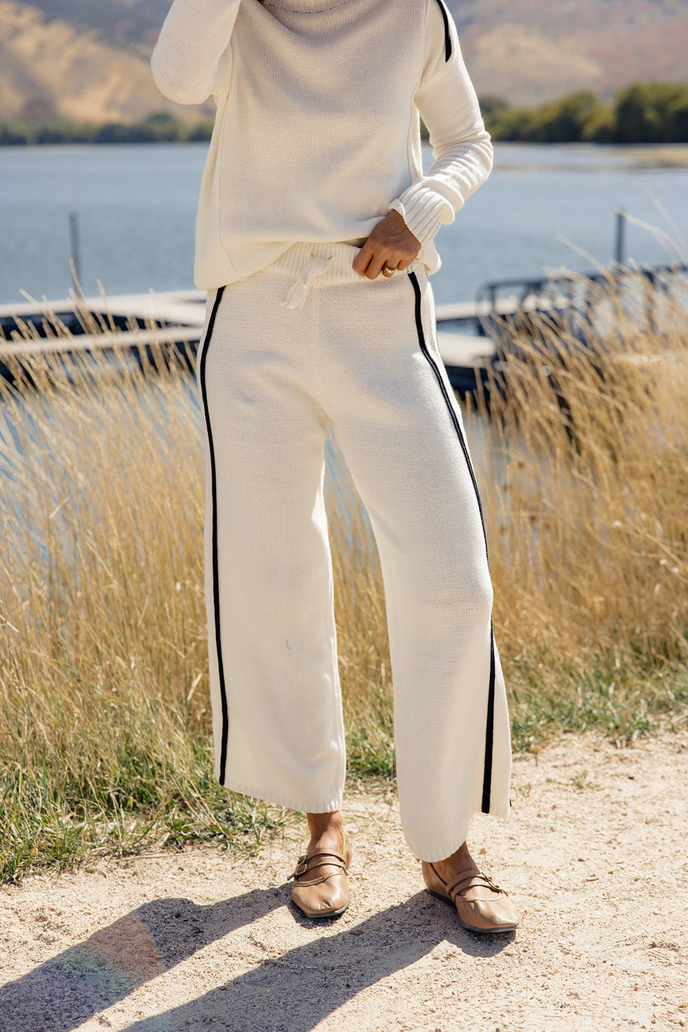 These white wide leg pants feature contrast side seams, a cozy fit, and a functional drawstring waist. Pair with the matching sweater or branch out and pair with your favorite graphic tees for a cute and comfy look!