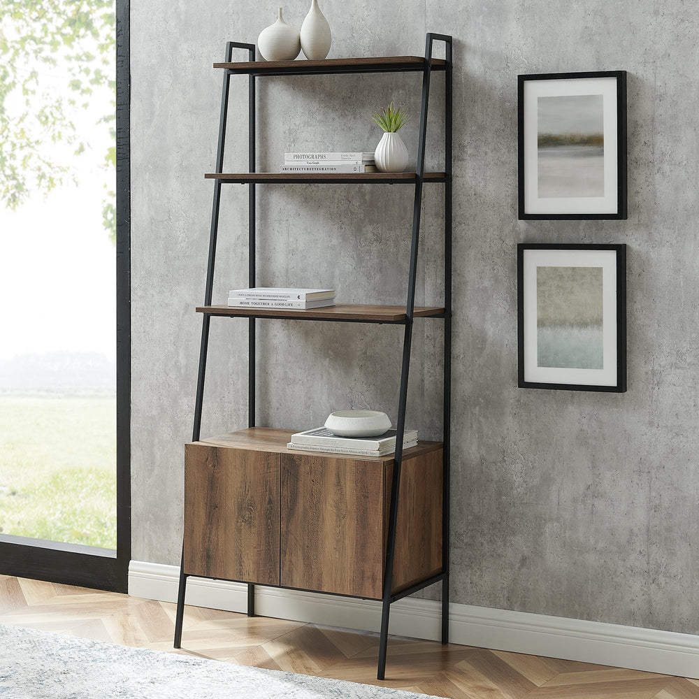 Transform your home with this ladder storage bookshelf as it will make an ideal functional and stylish accent. Features three shelves and a lower cabinet, all for storing your décor or storage items, while looking sleek and on-trend. The shelves and cabinet are supported on both sides by geometric-shaped, painted metal for a strong structure and add to the rustic style of the piece. The shelves and cabinet are all made of high-grade MDF, for a durable and reliable piece. Showcase your artwork, framed family trip pictures, or stack your book collection on this urban industrial-styled storage bookshelf, while also stashing away storage items behind the doors and inside the cabinet.