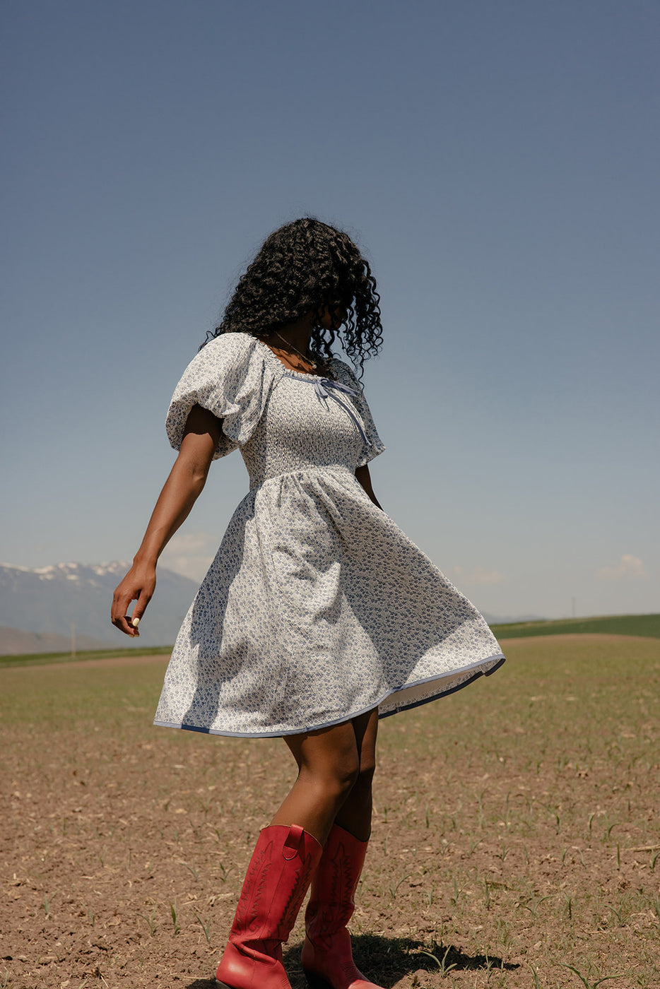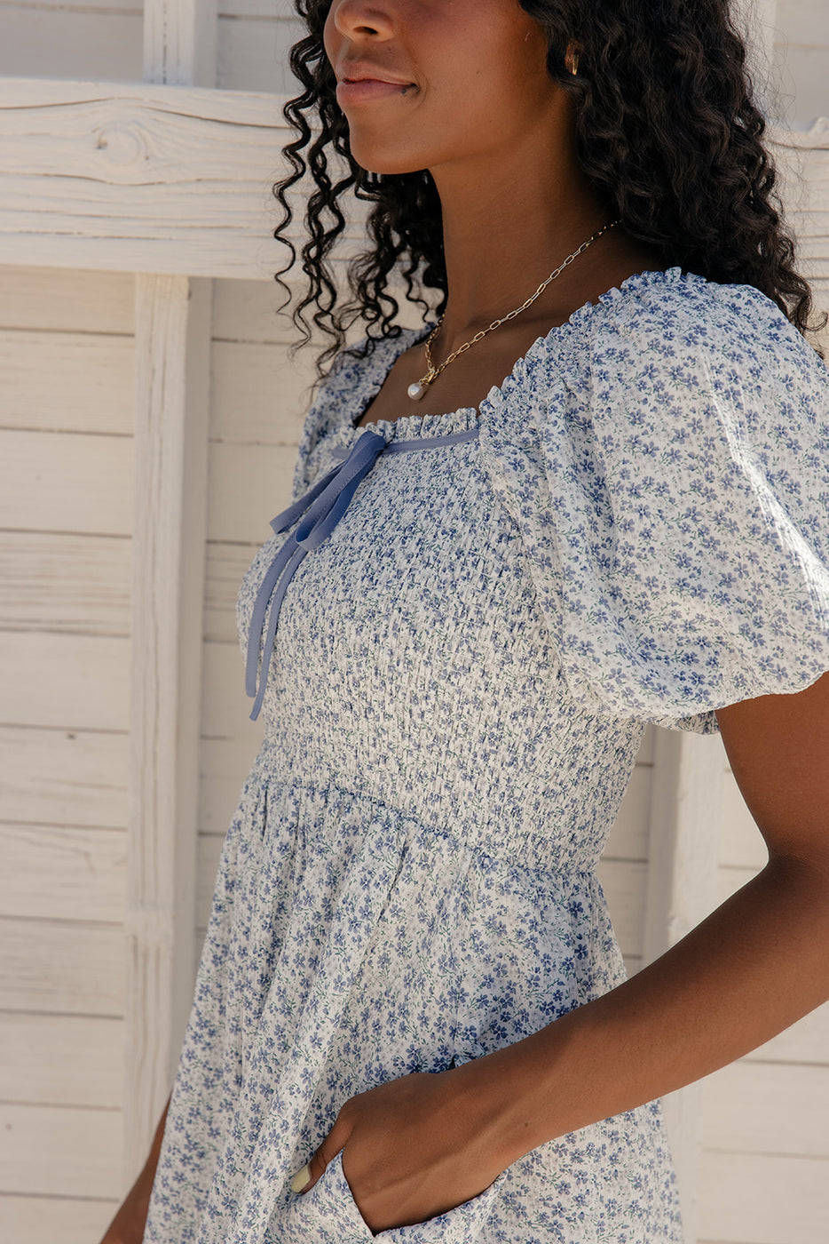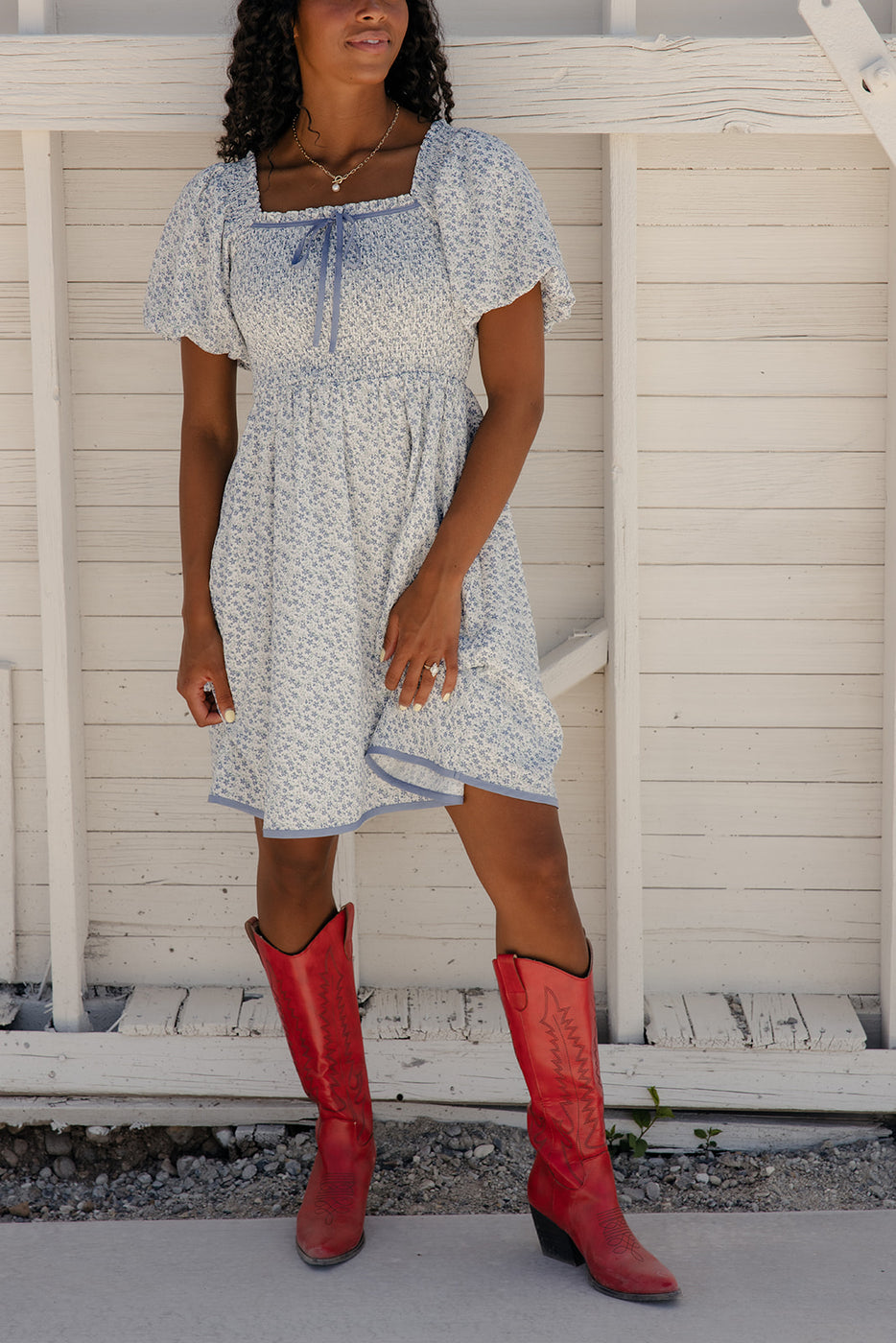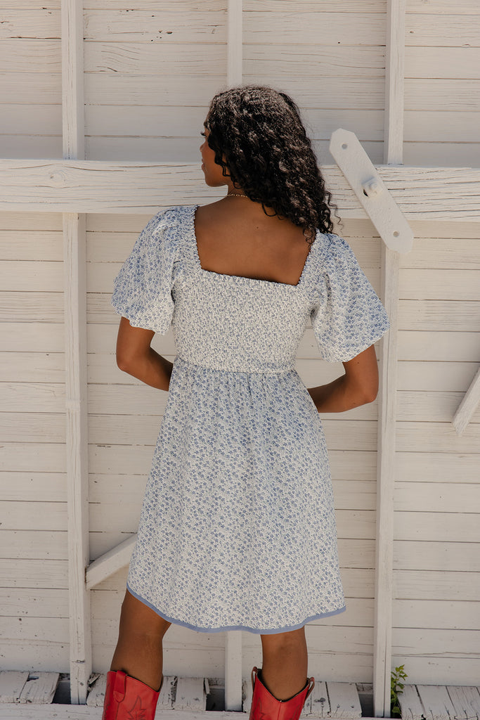 Say hello to your new summer favorite — this sweet blue floral mini dress features a smocked bodice, puff sleeves, and a square neckline with a dainty bow detail. Finished with soft blue trim and a twirl-worthy skirt, it's the perfect mix of feminine charm and everyday comfort.