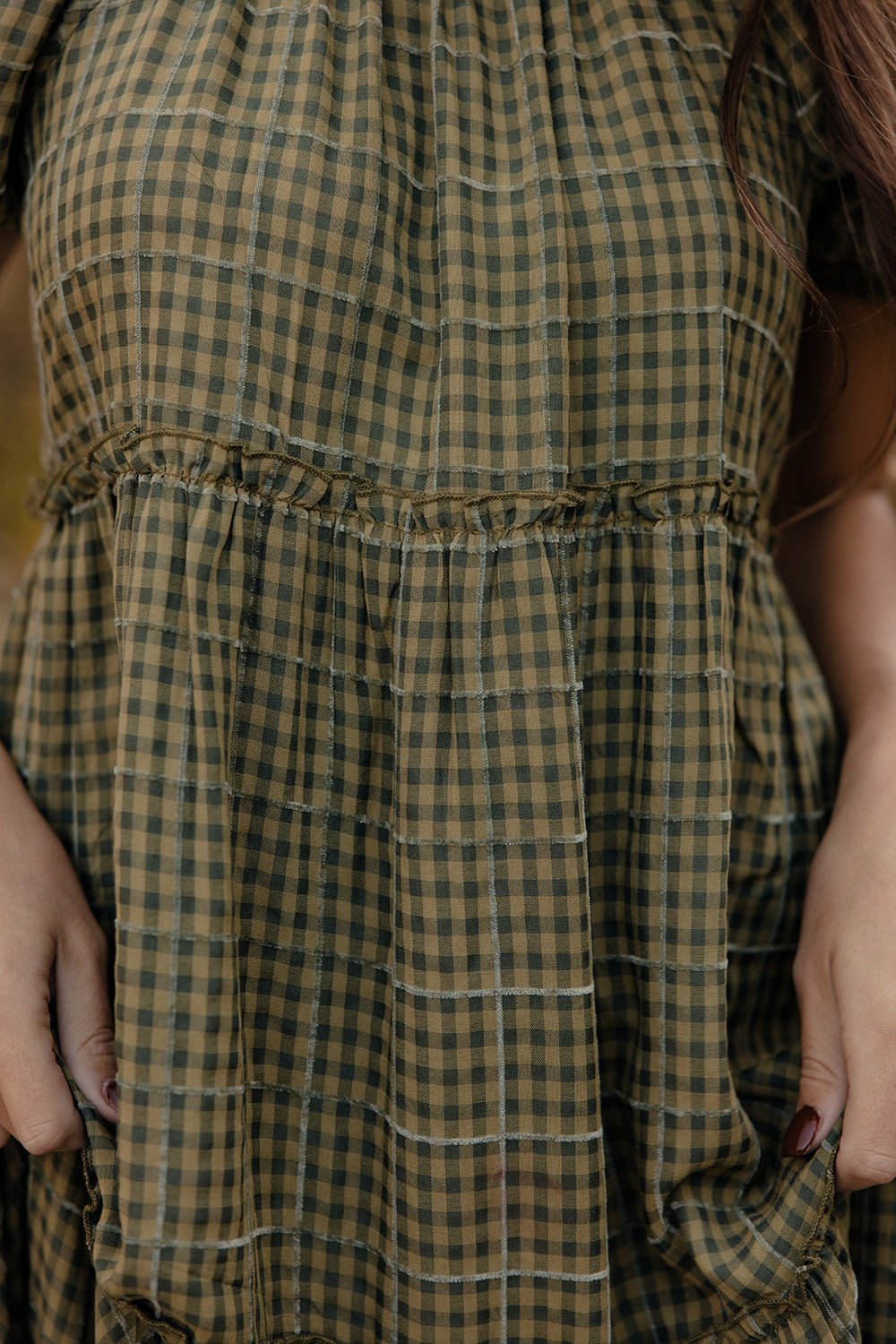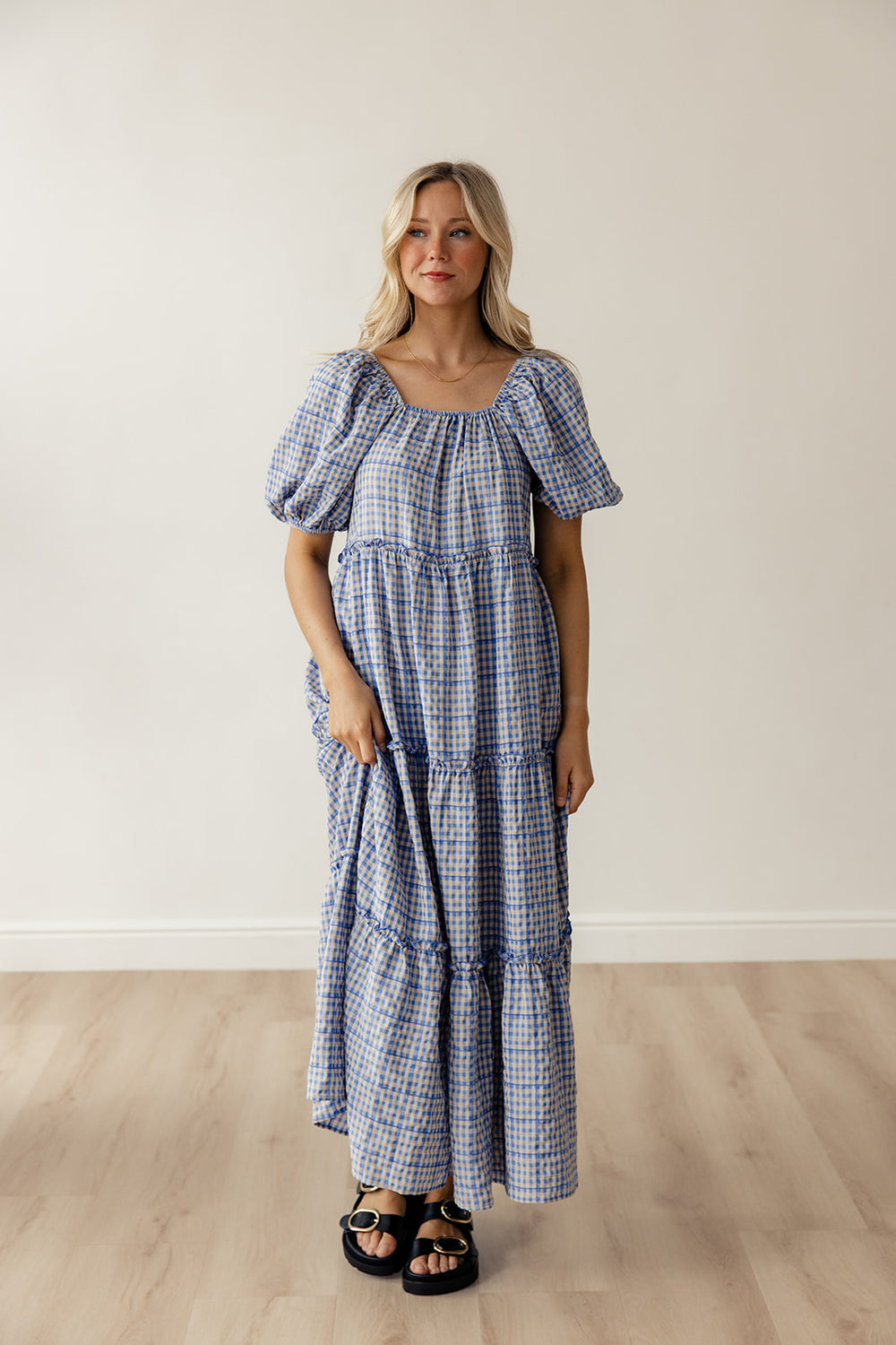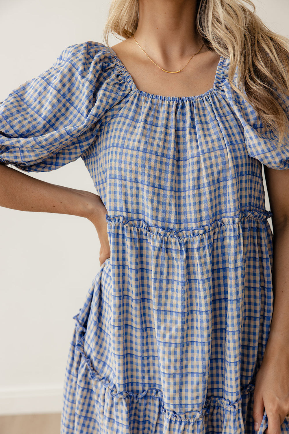 This brightly colored gingham beauty is perfect for any sunny day. With raglan-style puff sleeves, an elastic neckline, and a tiered skirt with sweet ruffle detailing, it's comfy and cute. Dress it up or down, and twirl your way through the day!