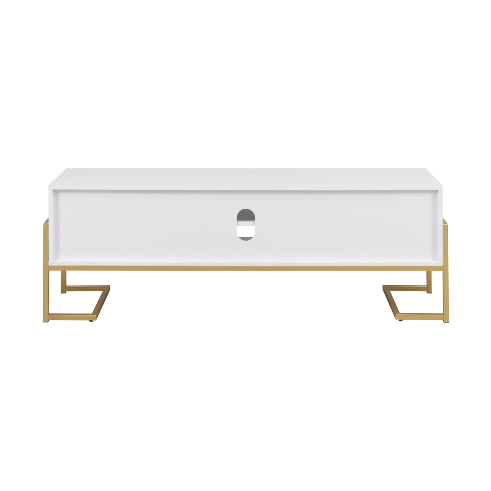 Glide into a subtly glam space that’ll invoke major interior inspo with the help of this modern, minimalist TV stand. Whether it’s in your entertainment area to help host your media components or in your living room to display décor, this console’s sleek silhouette will effortlessly update any corner. Two hardware-free drawers, open cubbies, and cord-management ports allow you to store your streaming devices and media console in sleek, organized style. With a small-space-friendly frame and a modern build that’ll easily complement all your other décor, this TV stand is at your service as whatever and wherever you need it to be.