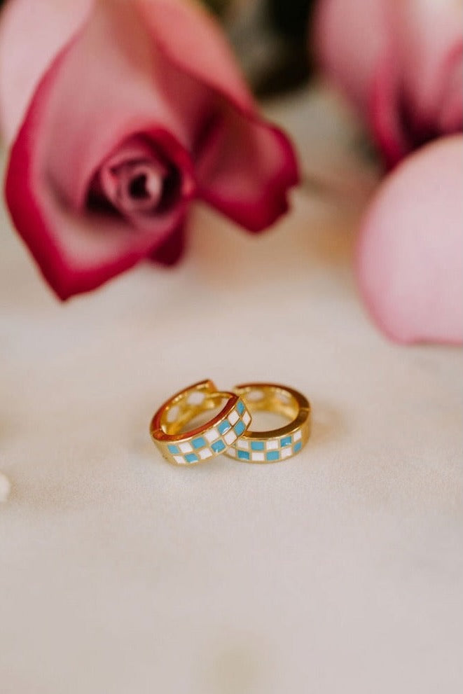 The Blue & White Checkered Hoops are made of high quality gold fill and are hypoallergenic and good for sensitive ears. They have a huggie closure style and are the cutest new jewelry trend!