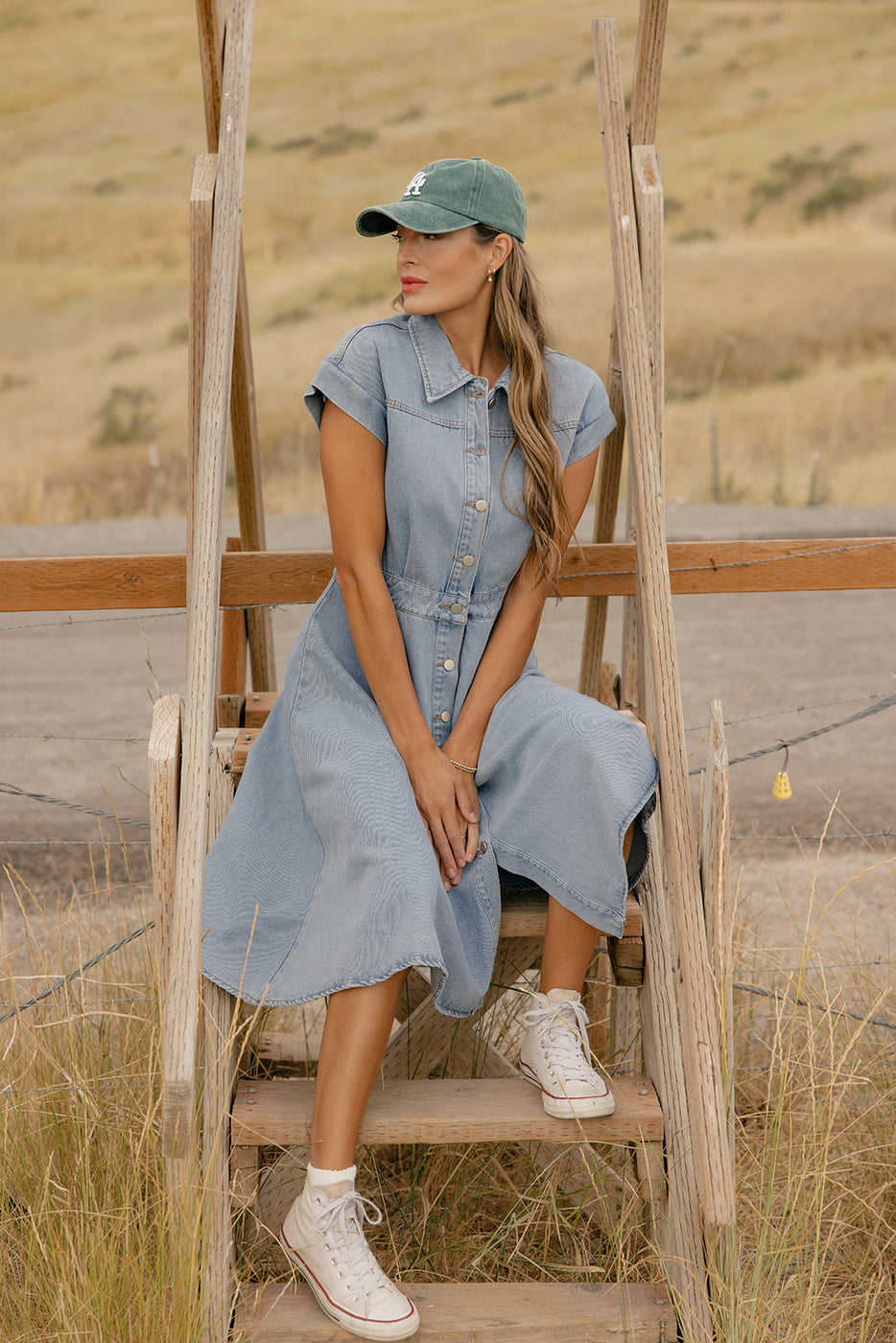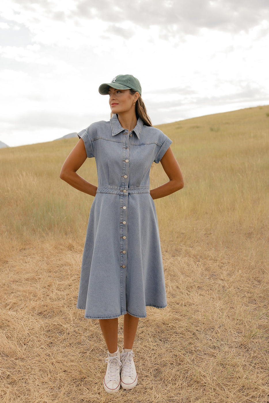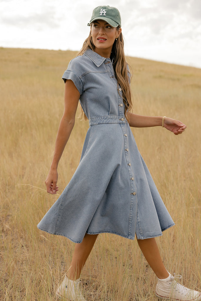 Structured yet feminine, this thick A-line denim dress features a collared neckline and buttons down the front for a timeless feel.
