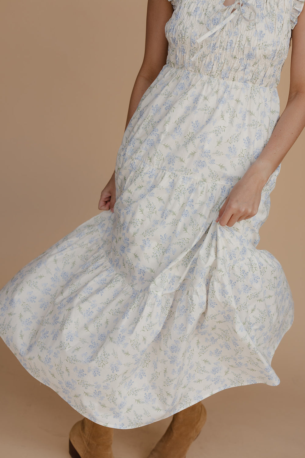 A romantic blue floral midi dress with a flattering fit-and-flare silhouette and feminine spring charm.