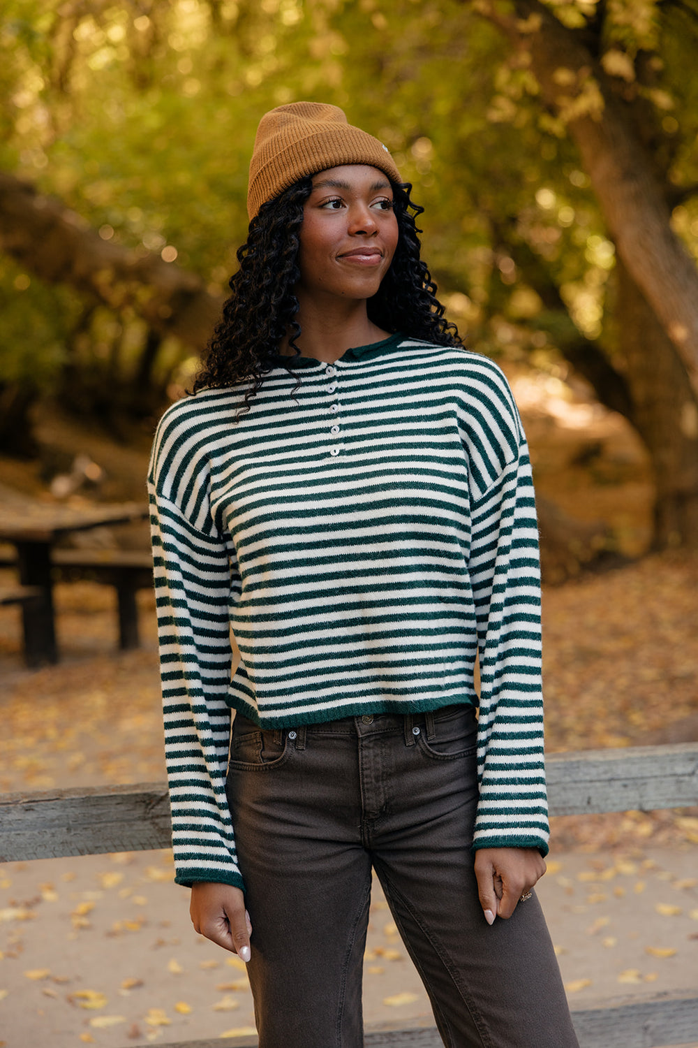Cozy and soft, the Boardwalk Henley Sweater is the same fit as our Single Moment Cardi but in a different design. With bold stripes and functional buttons, this is our go to sweater for Fall!