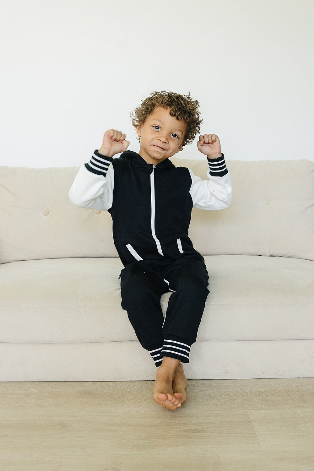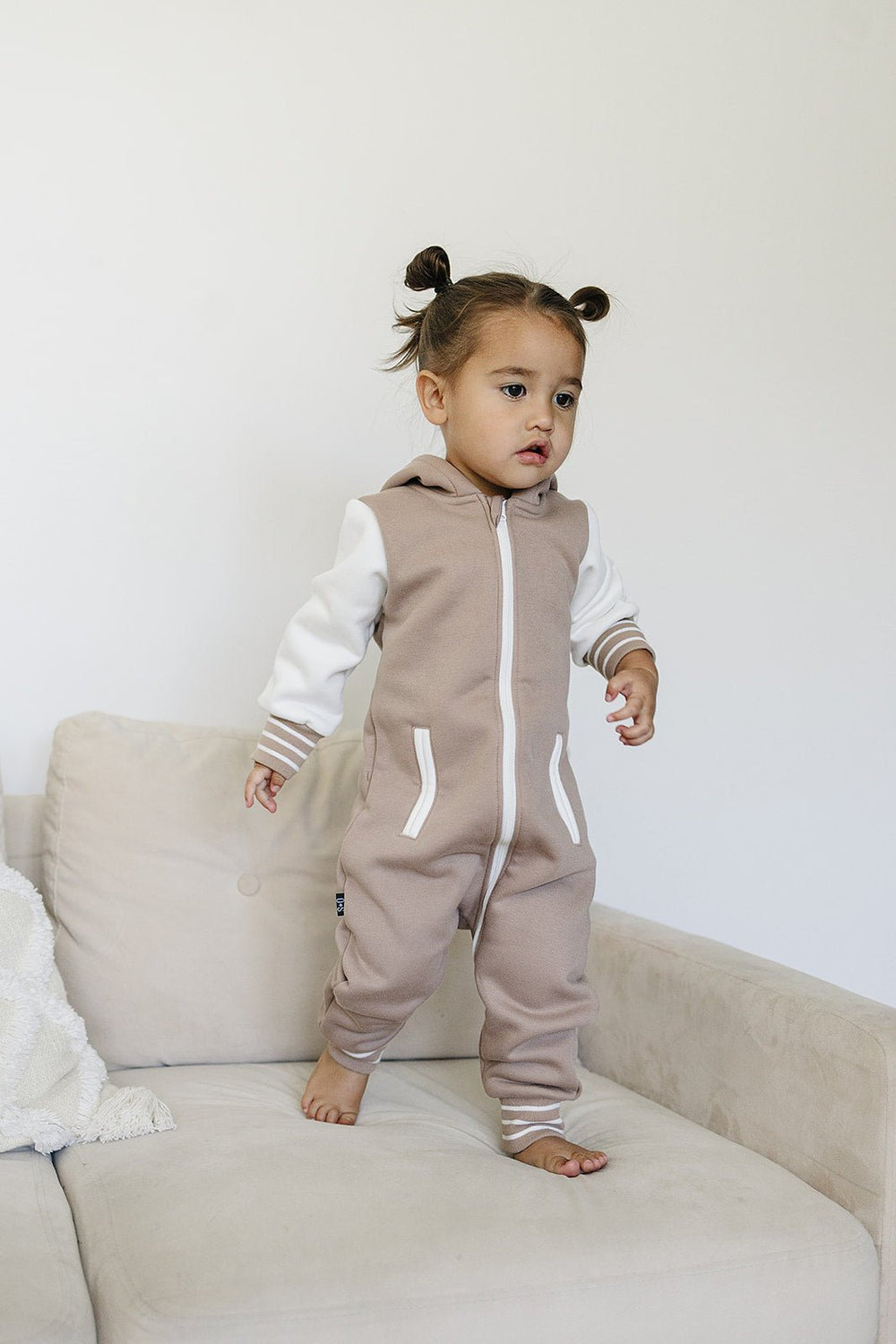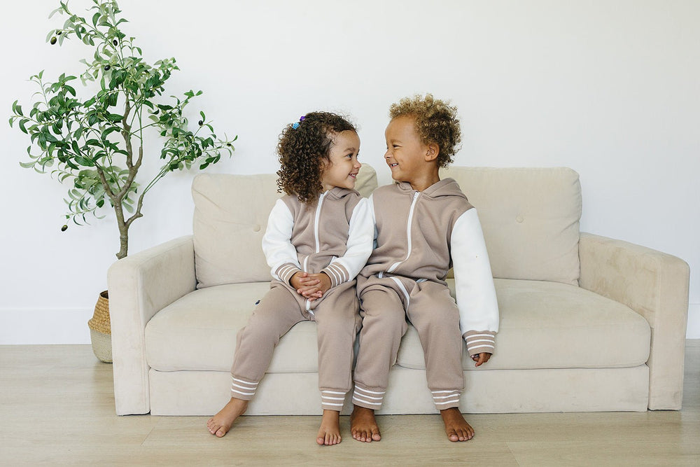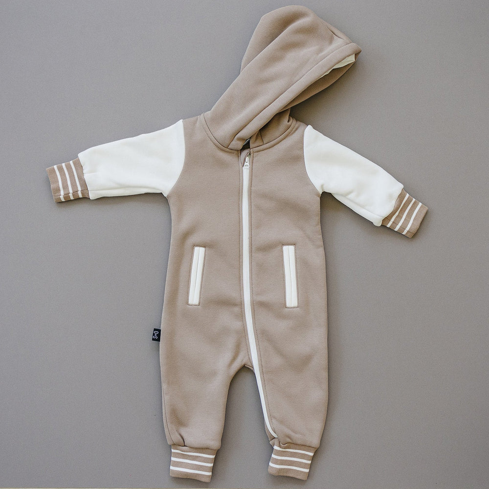 Add some "cool kid" style to your little one's wardrobe with the Brighton One Piece. With varsity jacket vibes, contrasting sleeves, pockets, and stripes, they'll be the most stylish and comfortable kid around.