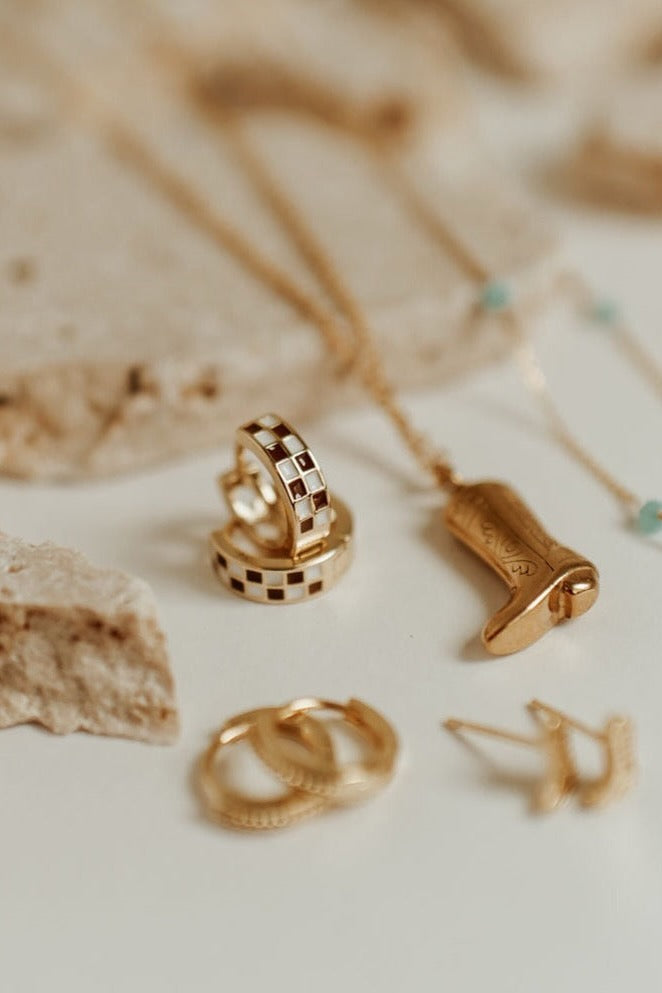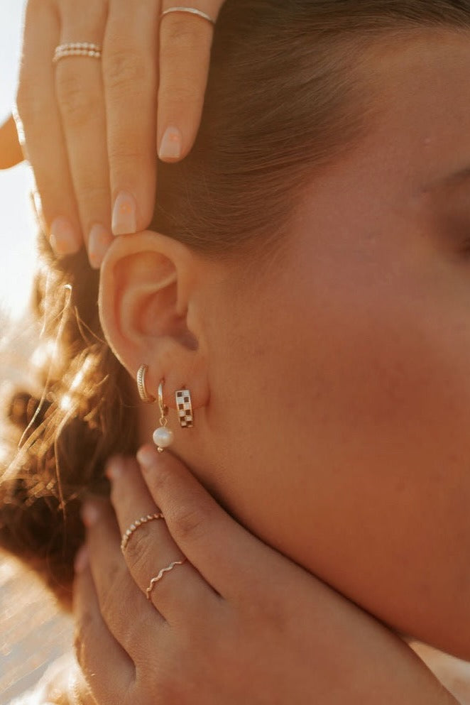 The Brown & White Checkered Hoops are made of high quality gold fill and are hypoallergenic and good for sensitive ears. They have a huggie closure style and are the cutest new jewelry trend!