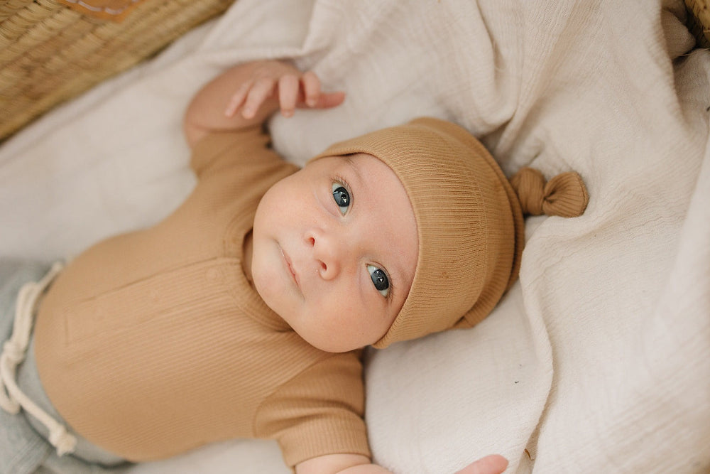 Introducing the Mebie Baby Organic Knot Hats, the ideal accessory for your new bundle of joy. Crafted from luxurious organic cotton, these hats are designed to keep your little one warm and cozy. Available in a range of gender-neutral colors, they perfectly complement our Organic Ribbed Gowns and Zipper One-Pieces. The softness of the fabric ensures maximum comfort for your baby, while the timeless design allows for easy passing down from one baby to another. Elevate your newborn's wardrobe with these essential knot hats.