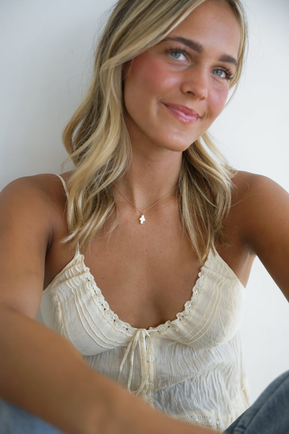 Handcrafted from gold filled .84mm chain, 5mm gold filled springring closure, gold filled pendant hardware, and 7-9mm warm white cross-shaped freshwater pearl pendant.