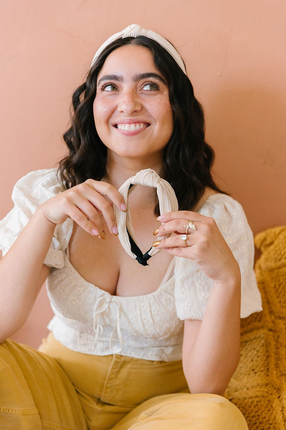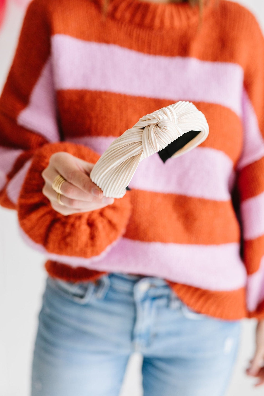 This pretty headband is the perfect neutral piece you need in your wardrobe! It is a hard headband wrapped in a pleated champagne silky fabric. I love wearing this when I don't have time do my hair and I need a quick way to spruce up! It is extremely comfortable and ads so much oomph to your look! You need it!