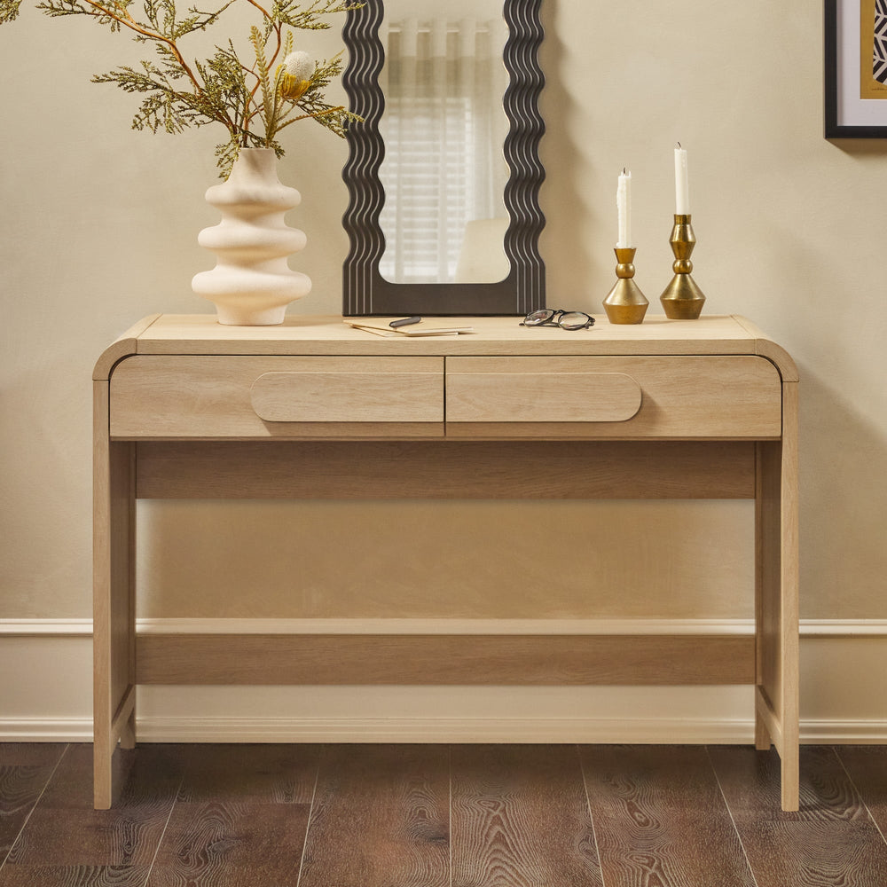 It’s time to say goodbye to purely functional furniture and hello to versatile pieces that play multiple roles in your home with this gorgeous rounded-edge desk. With its curved waterfall design, you’ll love putting this piece on display in the living room, guest room, or home office while also creating a helpful workspace. The statement wooden drawer pulls add interest and functionality, giving you ample storage space for pens, notepads, and your must-have midday snacks. The spacious work surface gives you plenty of room for your computer, books, or decorative pieces, so whether you use it for work, studying, crafting, or entryway storage, this unique desk is sure to become your new favorite piece.