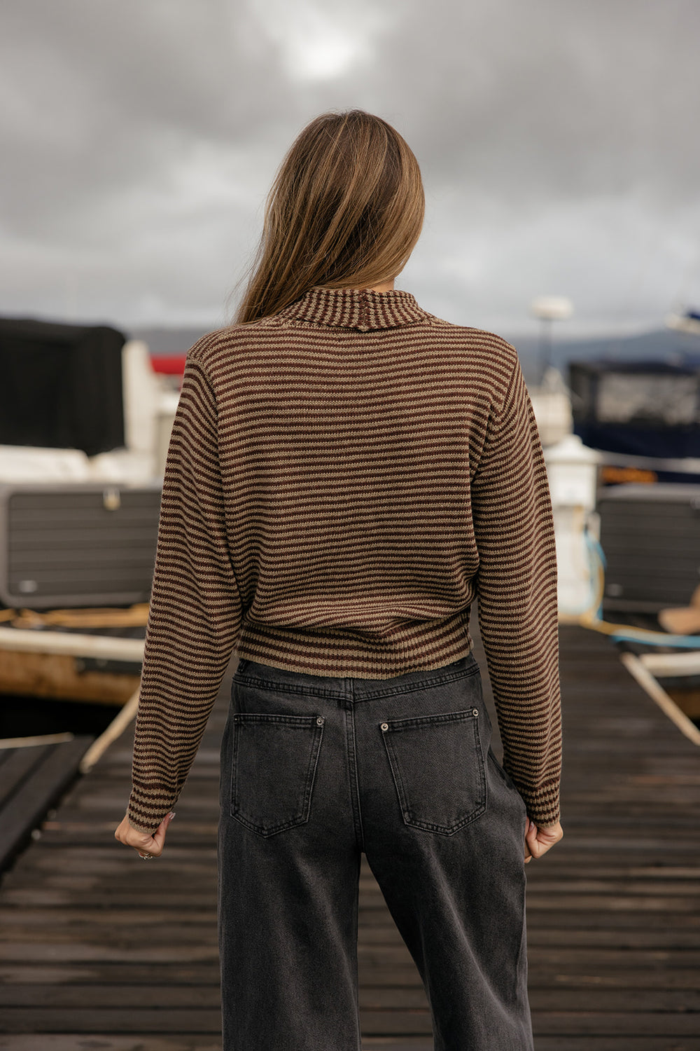A cozy striped sweater in earthy chestnut tones. With a relaxed fit and timeless stripes, this piece is an easy go-to for crisp fall days.