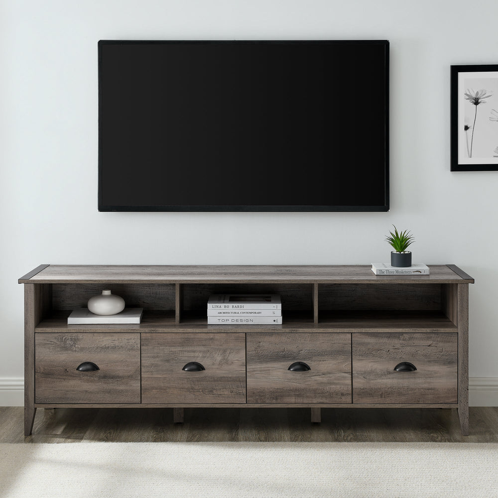 Cozy up with a chunky knit blanket and your go-to movie night snack to watch your favorite flick as your TV rests on or above this farmhouse-inspired TV stand. 3 cord management ports make this the perfect piece for your ultimate home entertainment center as you set up your TV, DVD player, gaming consoles, and streaming devices free from tangled wires. The rustic air of the wood finish and industrial flair of the antiqued gunmetal handles create a unique look that works perfectly in your living room, dining room, or entryway. With open and closed storage, you can easily transform this piece into a credenza, sideboard, or media console.