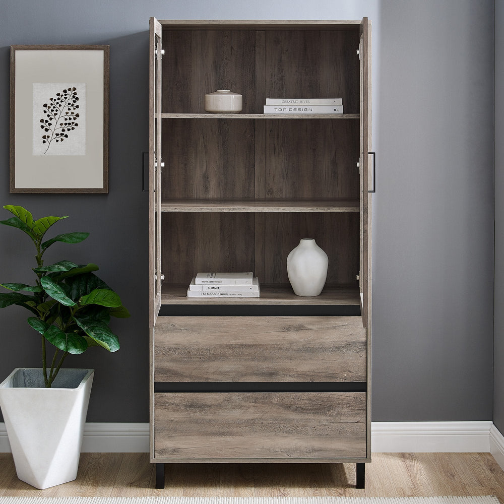 Showcase your best dishes or travel souvenirs with contemporary taste using this modern storage hutch. The tempered safety glass doors protect your prized possessions that are placed on the two adjustable shelves while allowing onlookers to admire. Place linens or entertainment essentials within the two drawers on smooth, telescoping metal glides for easy access. This storage cabinet is the perfect addition for a hallway, dining room, kitchen, or living room.