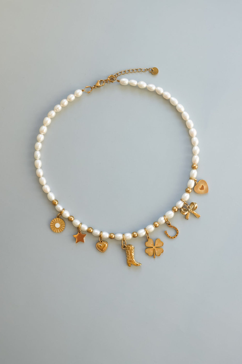 Handcrafted from 5–6mm rice pearls, 5mm gold-filled beads, gold-filled charms and jump rings, and finished with a 6mm gold-filled lobster clasp and 2” extender chain for the perfect fit. Hypoallergenic and built to last — just like your favorite pair of boots.