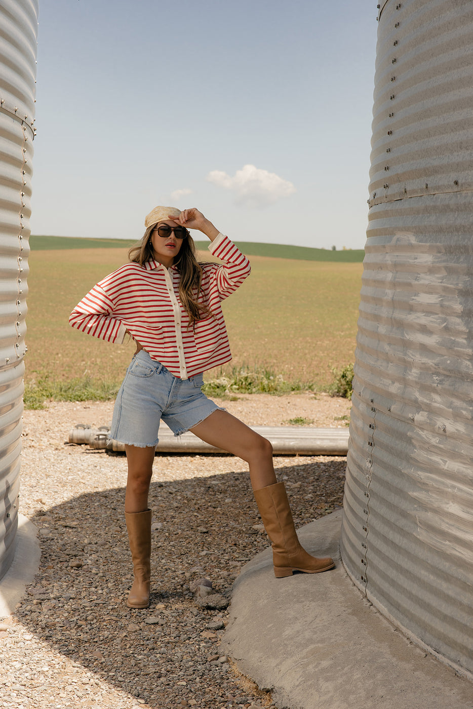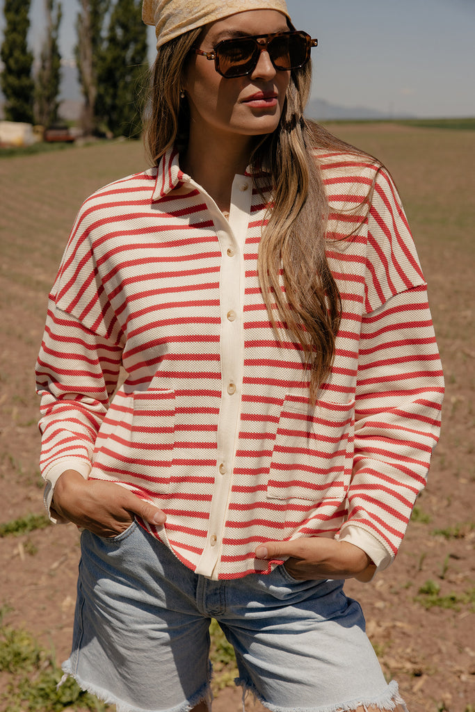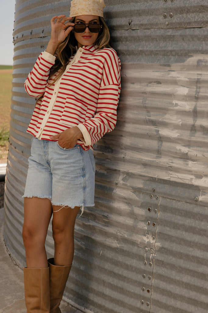 Add a playful pop to your wardrobe with this red stripe collared button cardigan. Featuring bold horizontal stripes, a classic collar, and a cozy knit feel, it’s the perfect blend of retro charm and everyday comfort. Style it buttoned up or layered over your favorite basics.