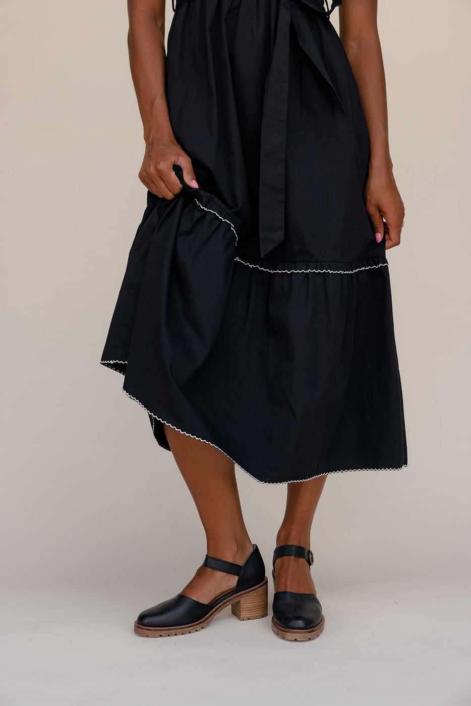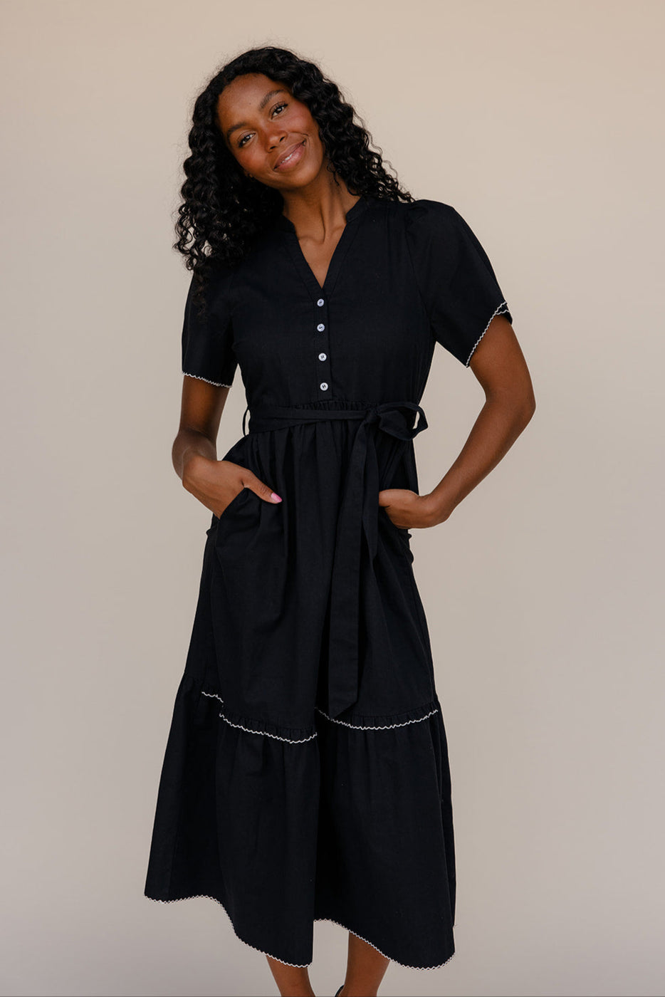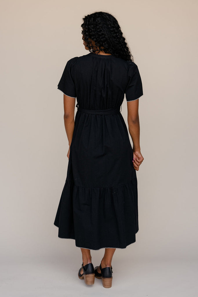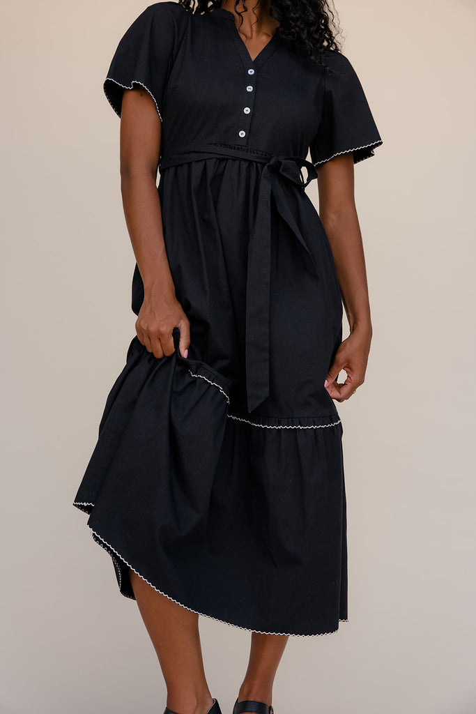 This black maxi is all about the details — white lace trim, a statement collar, and dainty buttons for a look straight out of study hall romance.