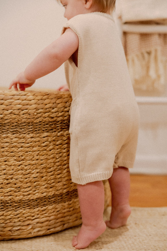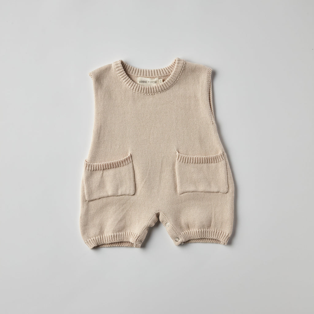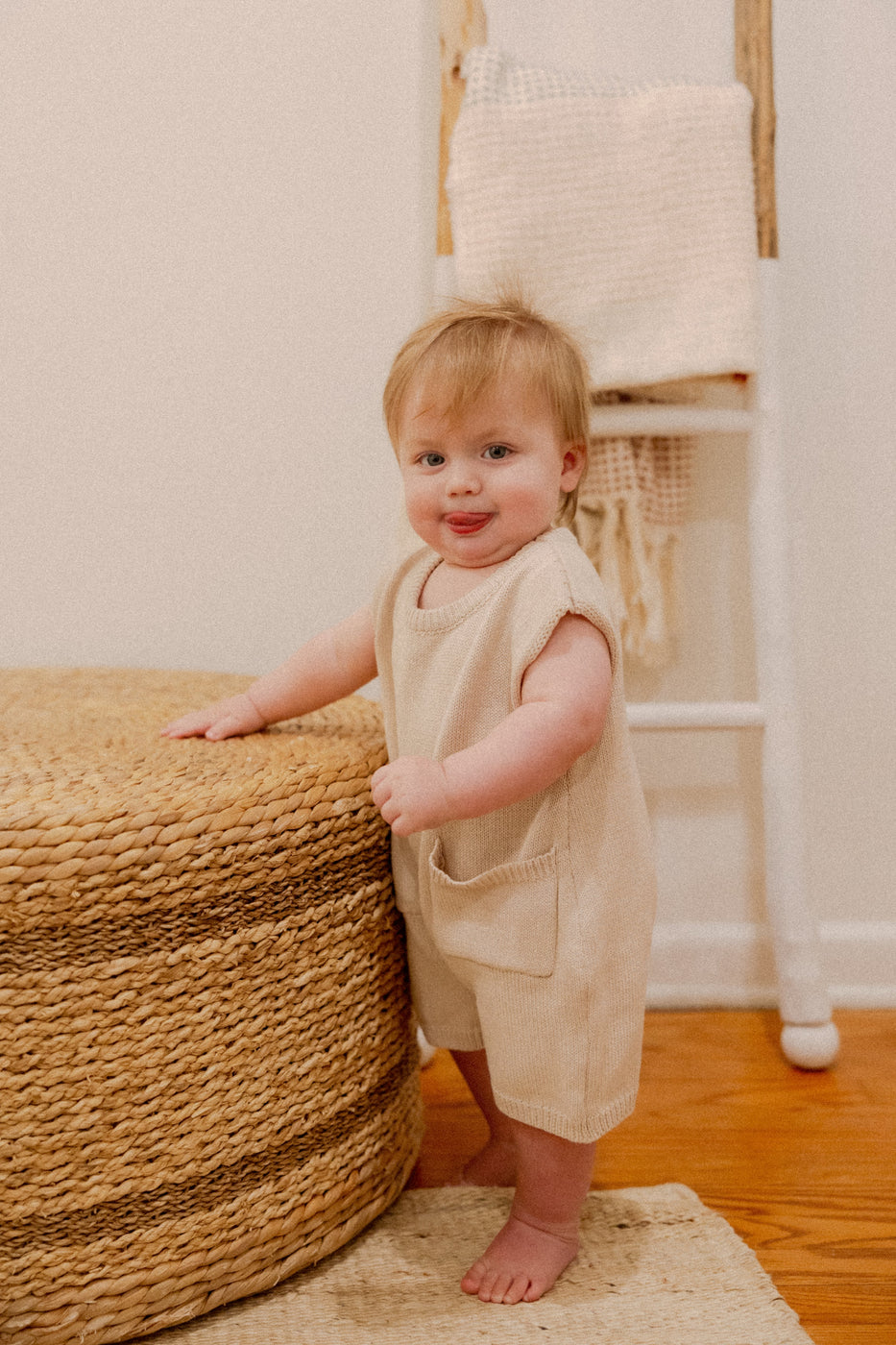The Covey Knit Romper is perfect for your little one's spring and summer wardrobe. Made with a comfy and cute knit material, this romper features a raw hem, front pockets, and is sleeveless for warmer days. Ideal for both special occasions and playtime, this romper is perfect for boys and girls up to young toddlers.