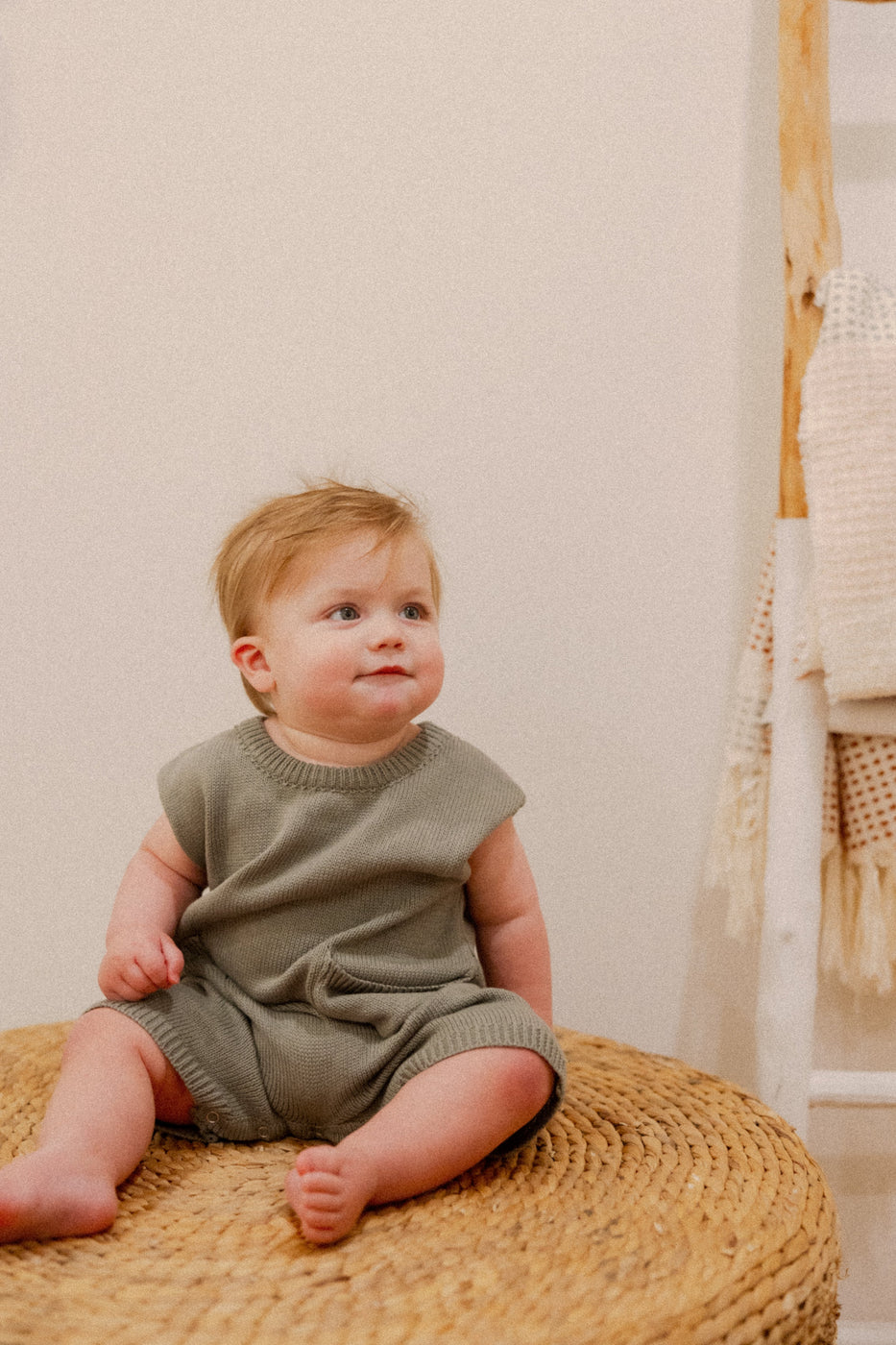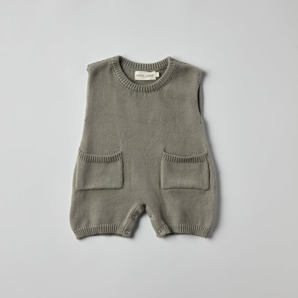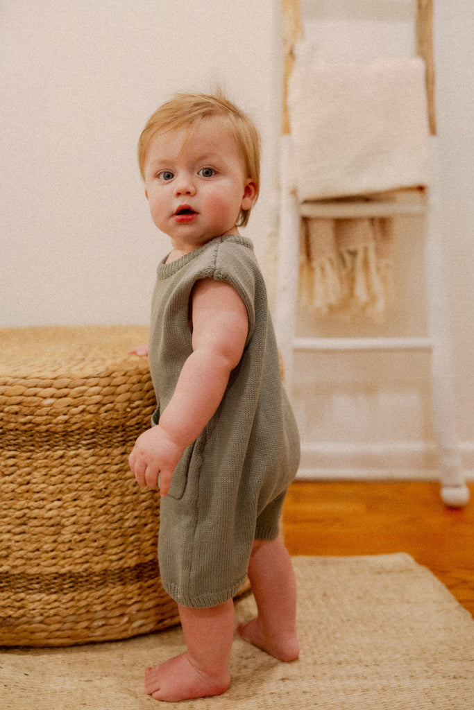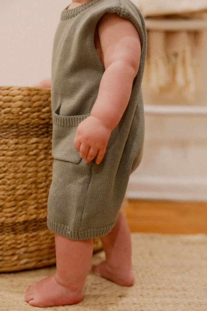 The Covey Knit Romper is perfect for your little one's spring and summer wardrobe. Made with a comfy and cute knit material, this romper features a raw hem, front pockets, and is sleeveless for warmer days. Ideal for both special occasions and playtime, this romper is perfect for boys and girls up to young toddlers.