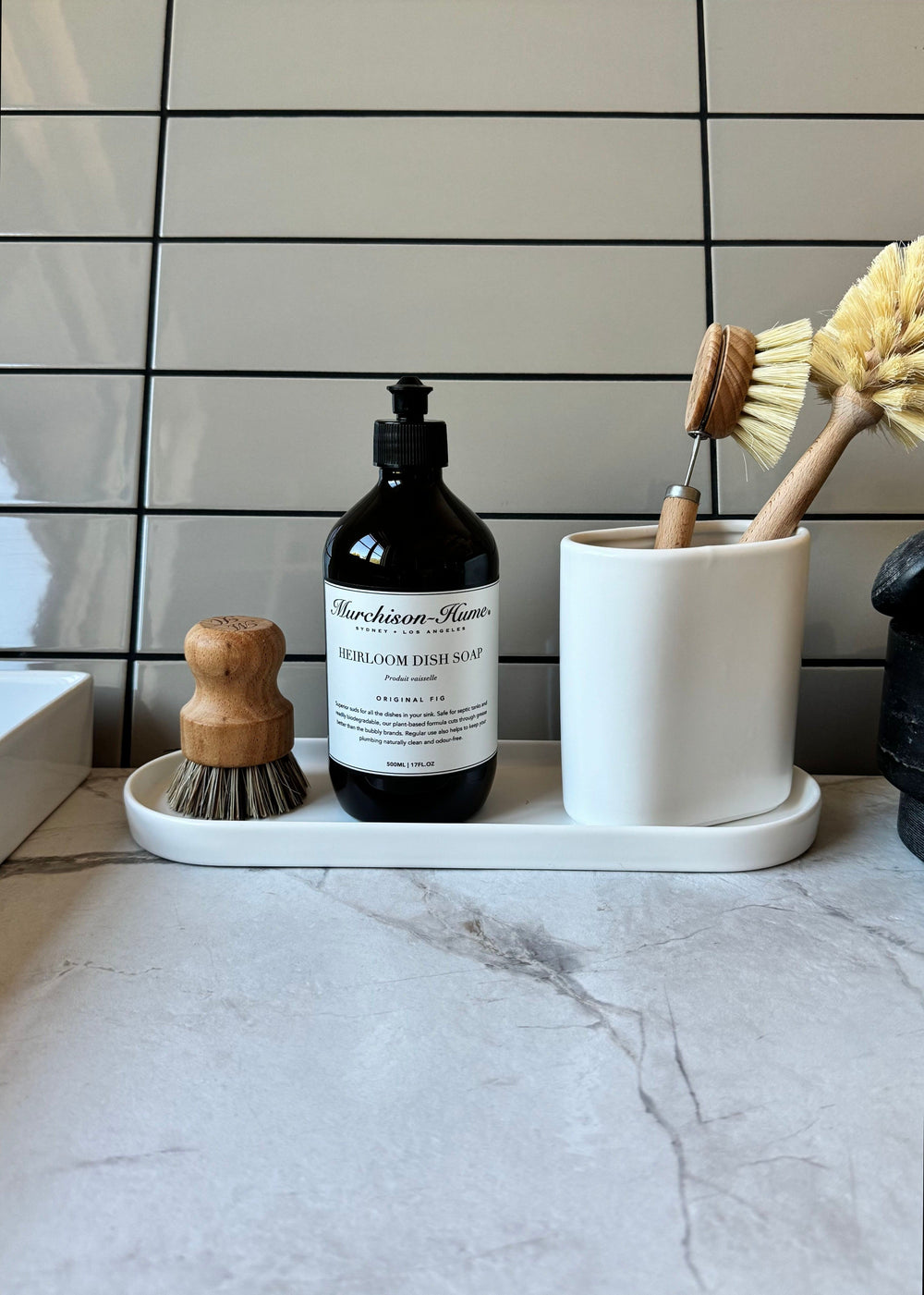 Instantly elevate your sink-side situation with this elegant ceramic tray. Generously sized, it neatly holds Heirloom Dish Soap, plus two 500ml bottles, but it is still chic enough to pull double duty as a decorative catchall for corralling keys, glasses, or jewellery. Use it instead of a coaster to protect vulnerable surfaces from oil drips, wine stains, candles, a warm cup, or a cold drink. Clever.