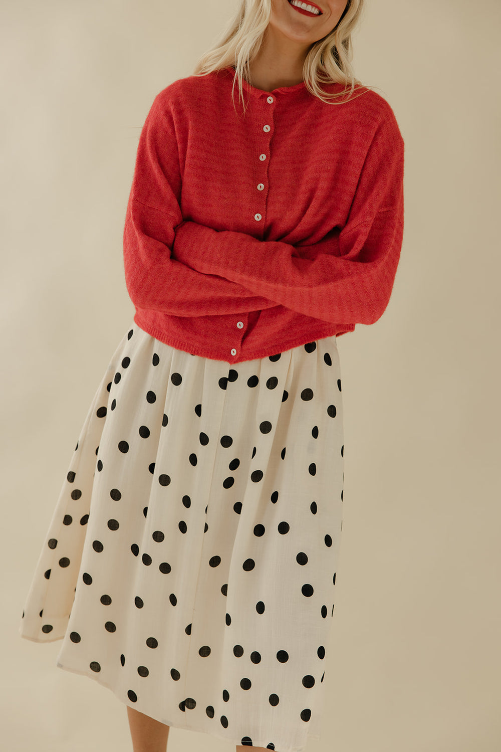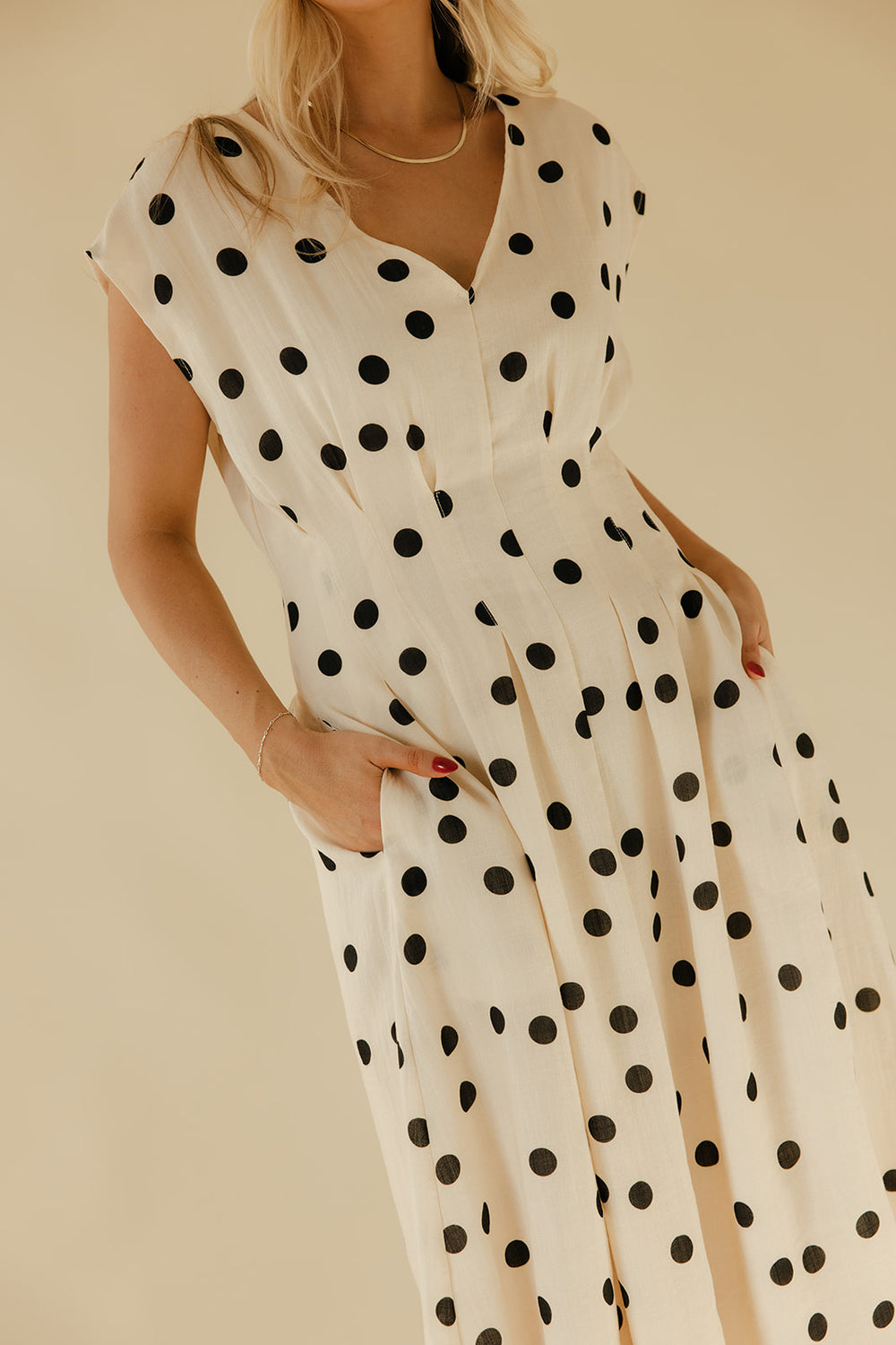 A timeless white polka dot dress with a flattering v-neckline and lightweight, flowy fabric. Easy, feminine, and comfortable, this dress moves beautifully and styles effortlessly for both casual days and dressed-up moments.