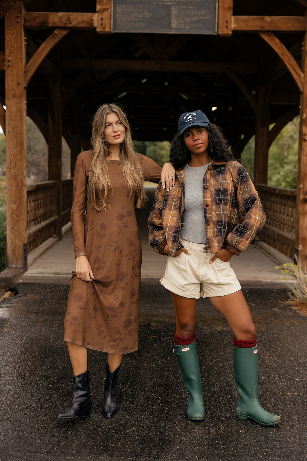 A warm-toned midi dress with soft florals and long sleeves for cozy coverage. Effortless and flattering for everyday wear or special occasions.