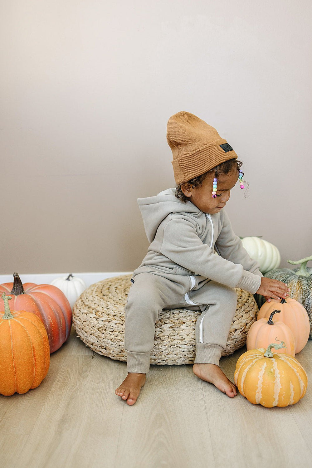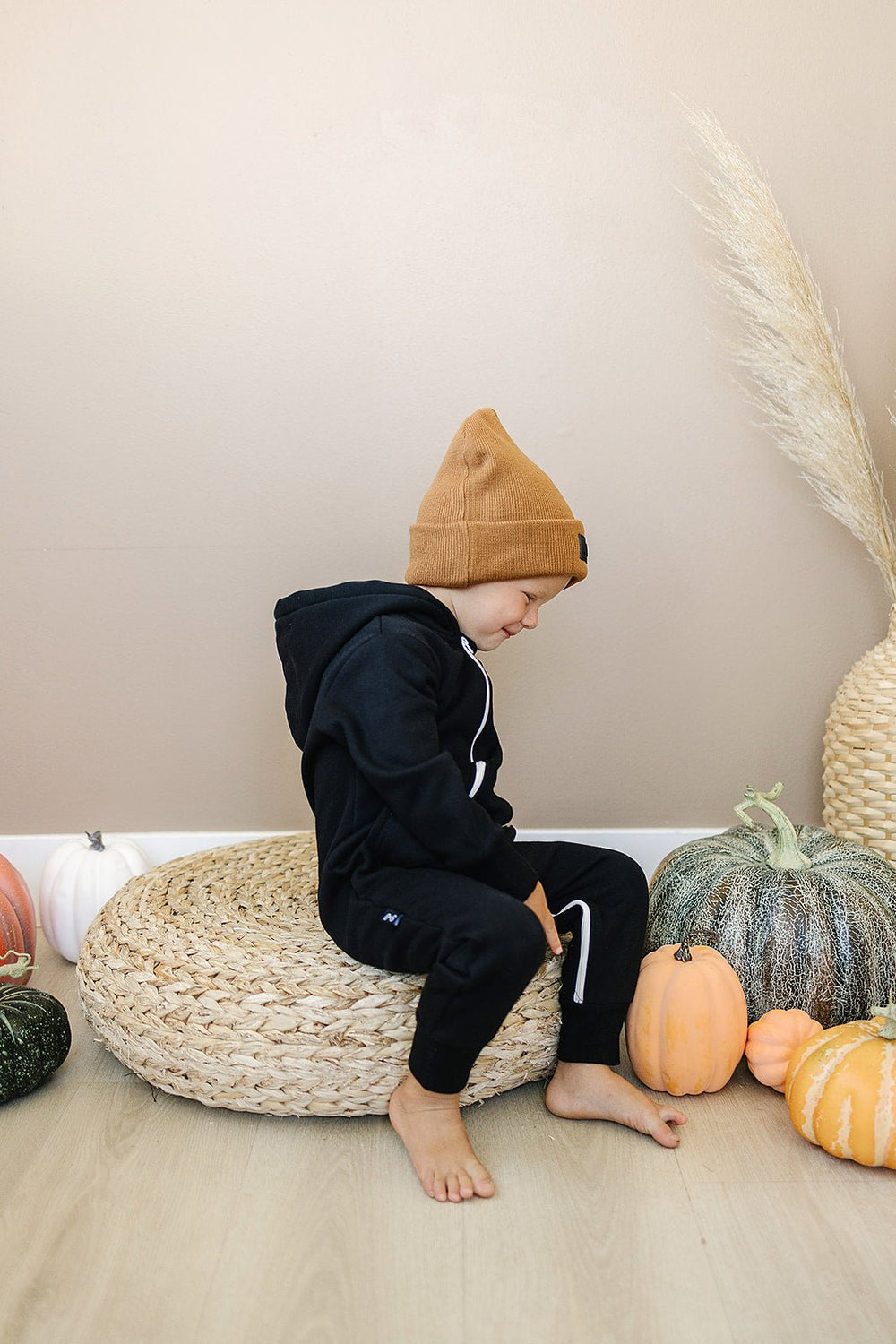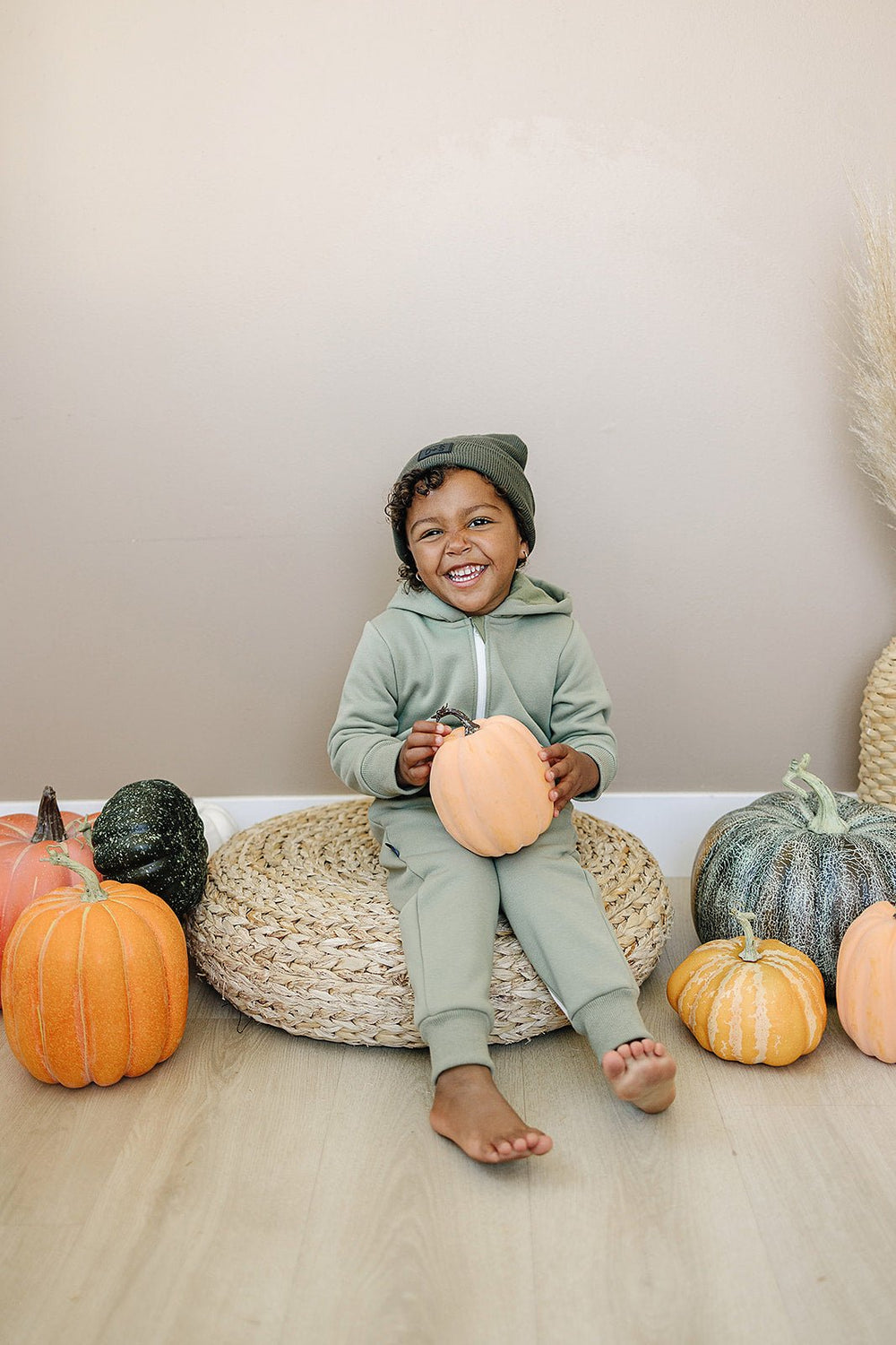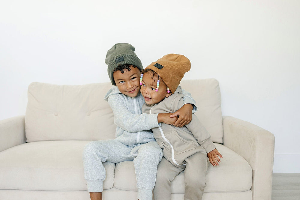 The Dylan One Piece is back and in three new colors! This cozy one piece sweatsuit is perfect for lounging around the house, with a full length zipper for easy on/off and kangaroo pouch pockets on the front for all their stuff. Plus, it features a hood to keep them warm and looking fly when they're out and about!