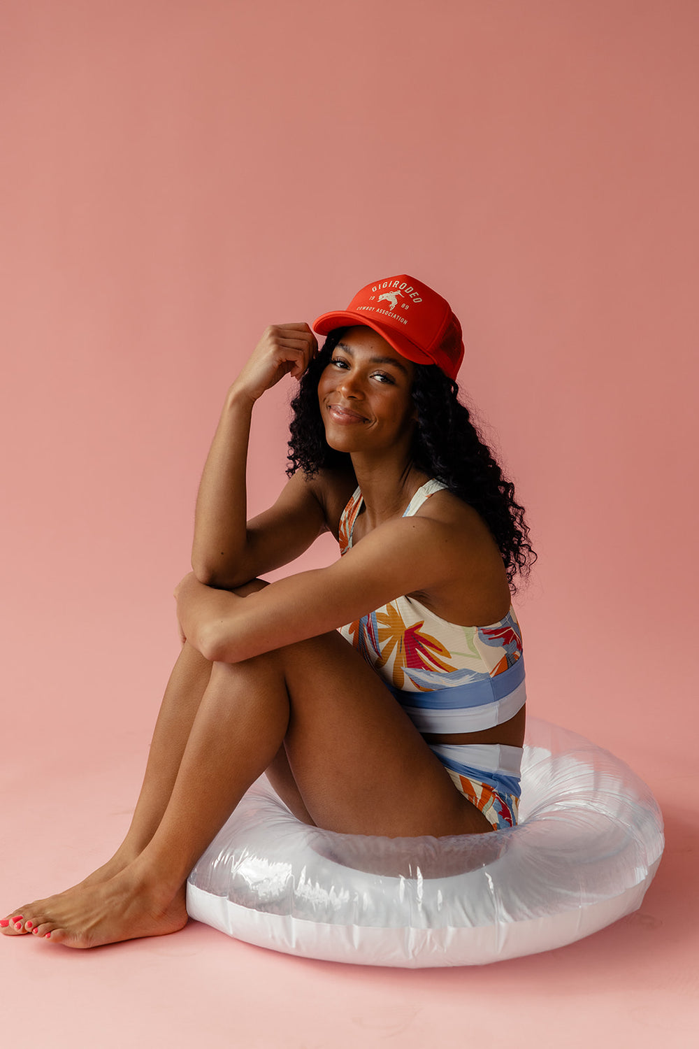 // paired with the gigi rodeo foam trucker hat in red + eden colorblock bottoms