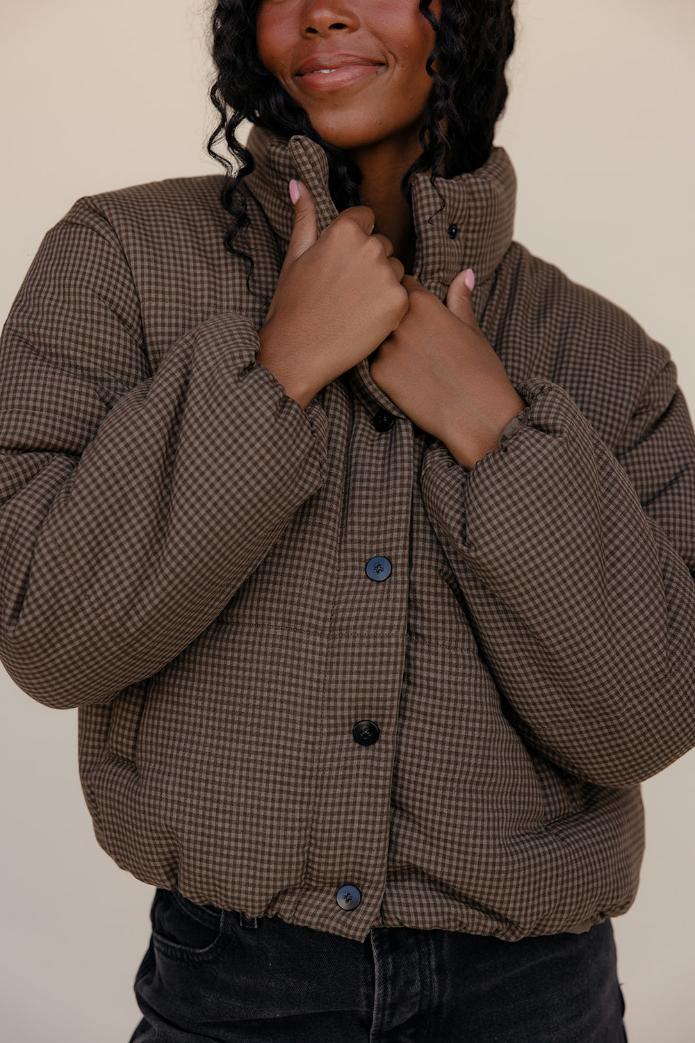 Country charm meets city warmth. This puff coat features a classic gingham print with a modern silhouette—cozy enough for chilly days, stylish enough for every outing.