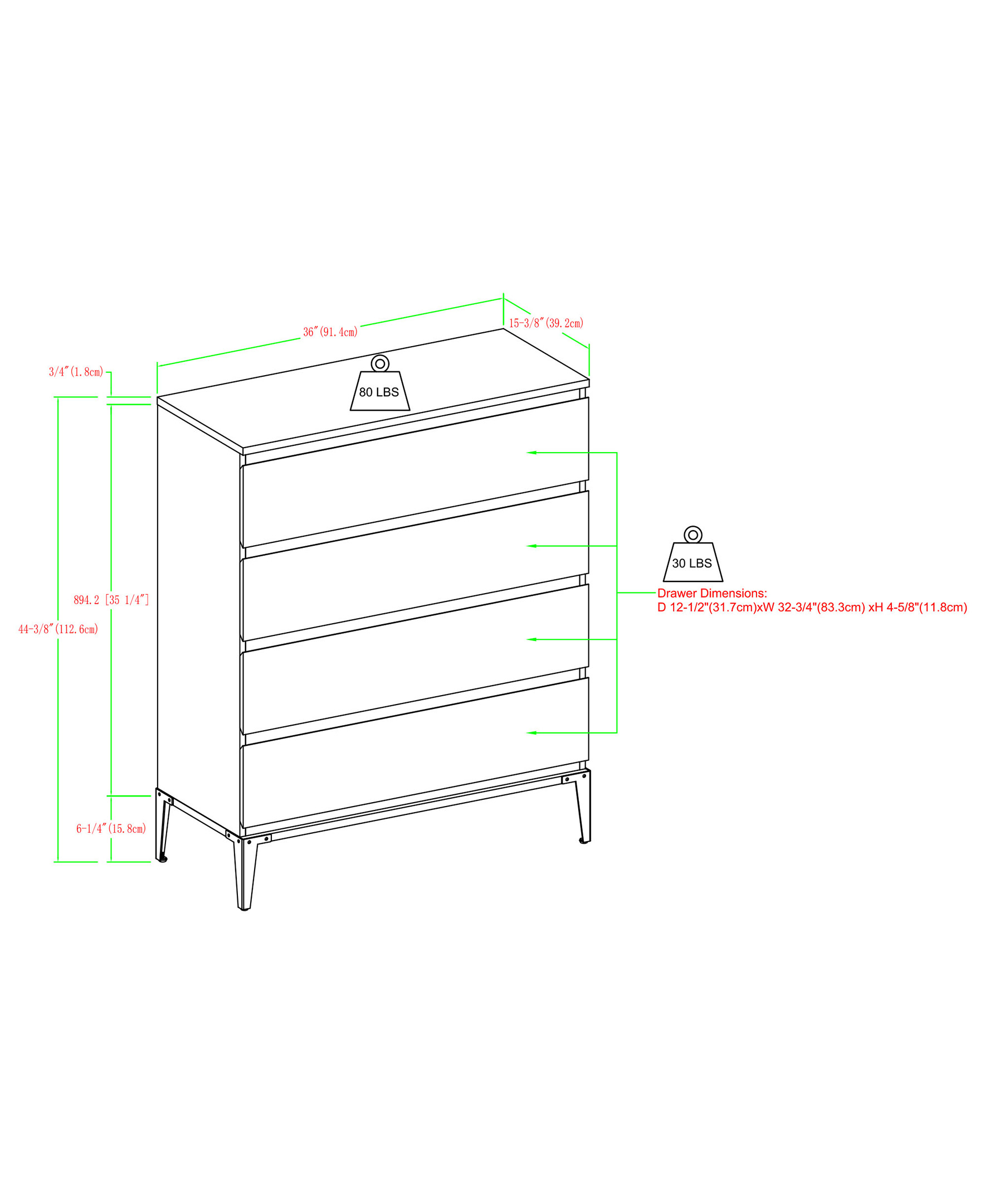 English Oak dimensions: 44" H x 36.25" L x 15.75" W 116 LBS Assembly Instructions Line Drawing
