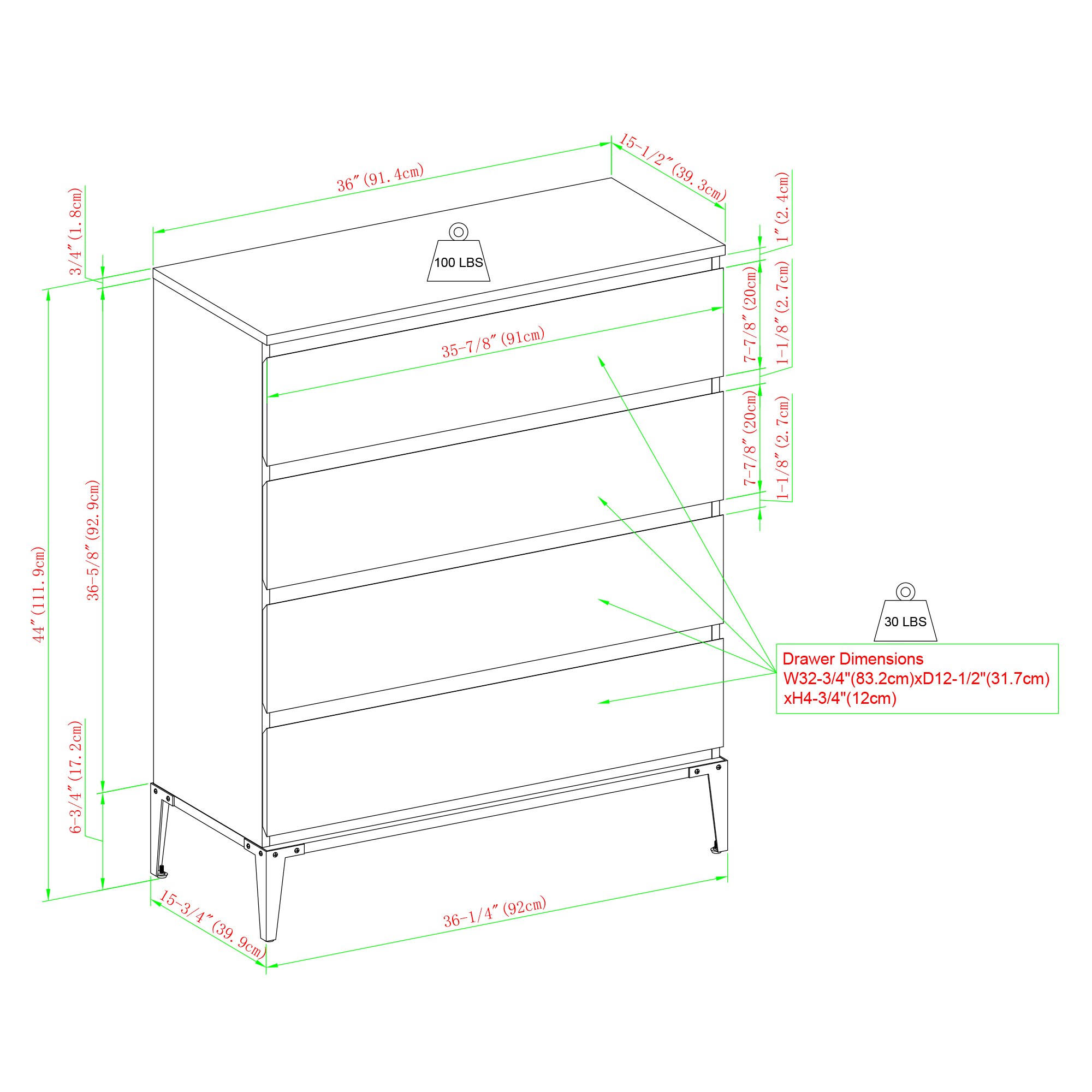 Dark Walnut dimensions: 44.25" H x 36" L x 15.25" W 97LBS Assembly Instructions Line Drawing