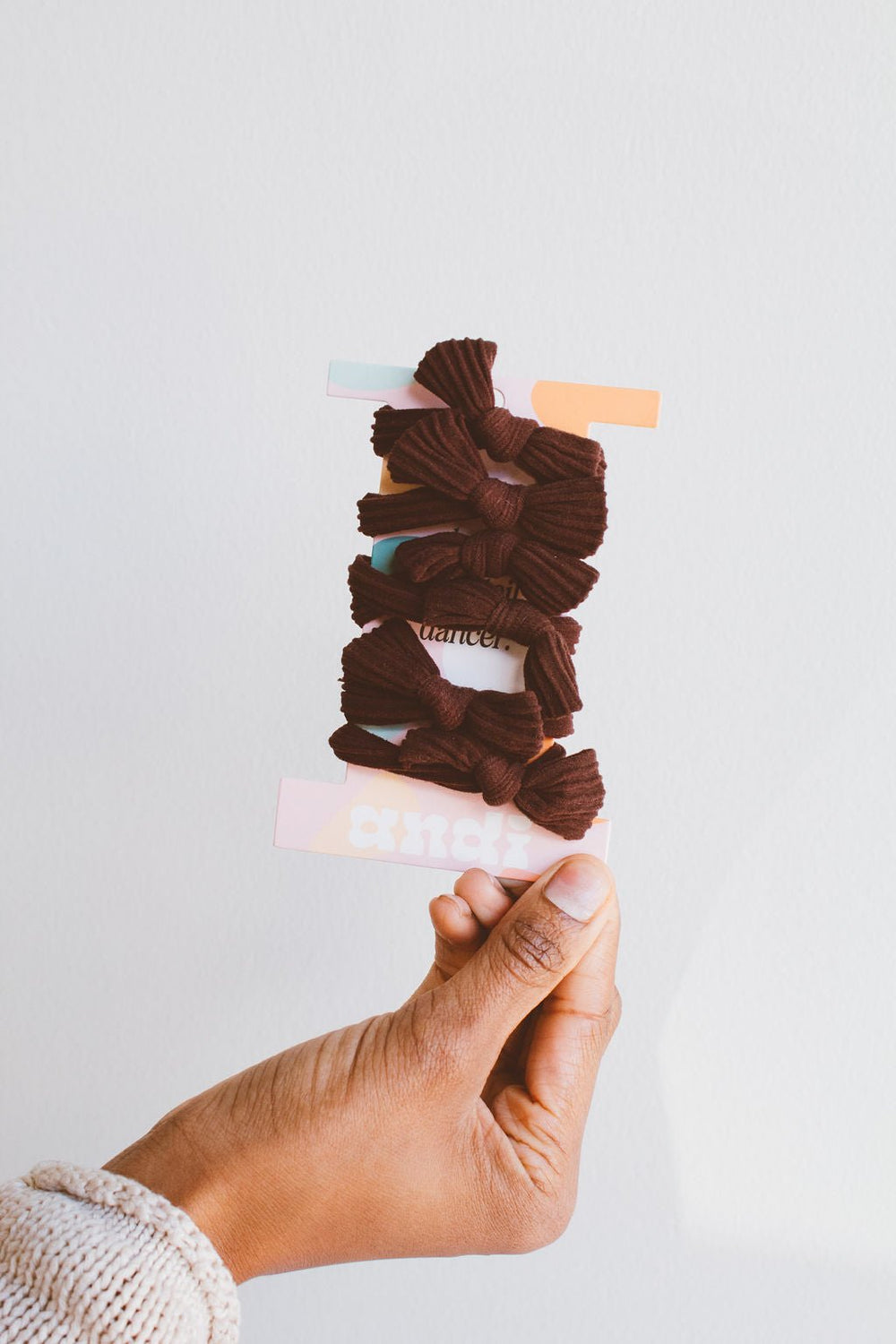 This six-pack of stretchy hair ties will be your new go-to hair tie! They feature an adorable small bow with a ribbed textured fabric. They're perfect for any hairstyle and are so gentle on your hair. They are available in 5 different colors; Pink, Black, Dark Brown, Light Brown, and Tan.