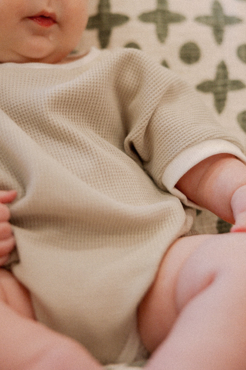 Stay cozy and stylish with our Ezra Waffle Knit Romper! Made from soft waffle knit material, this romper features an oversized fit for maximum comfort. Its neutral color makes it versatile for any occasion, making it a must-have for your baby's wardrobe.