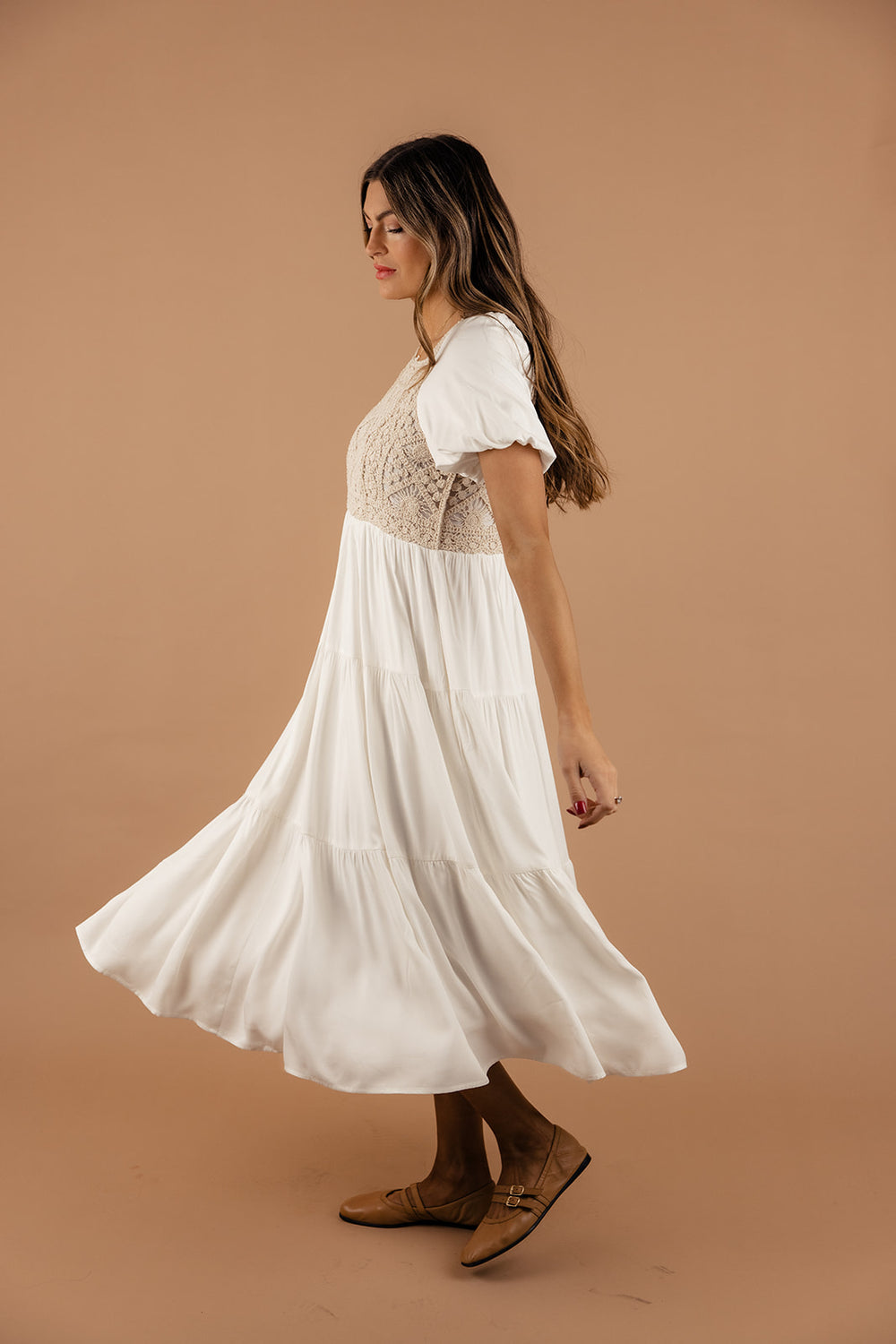 Featuring a beautifully crocheted bodice and a square neckline, this dress adds a touch of elegance to your wardrobe. The tiered skirt creates a flattering silhouette, while the puff sleeves add a playful twist. Perfect for any special occasion or a day out, this dress is sure to turn heads wherever you go. I'm telling you, wearing this dress just feels like home.