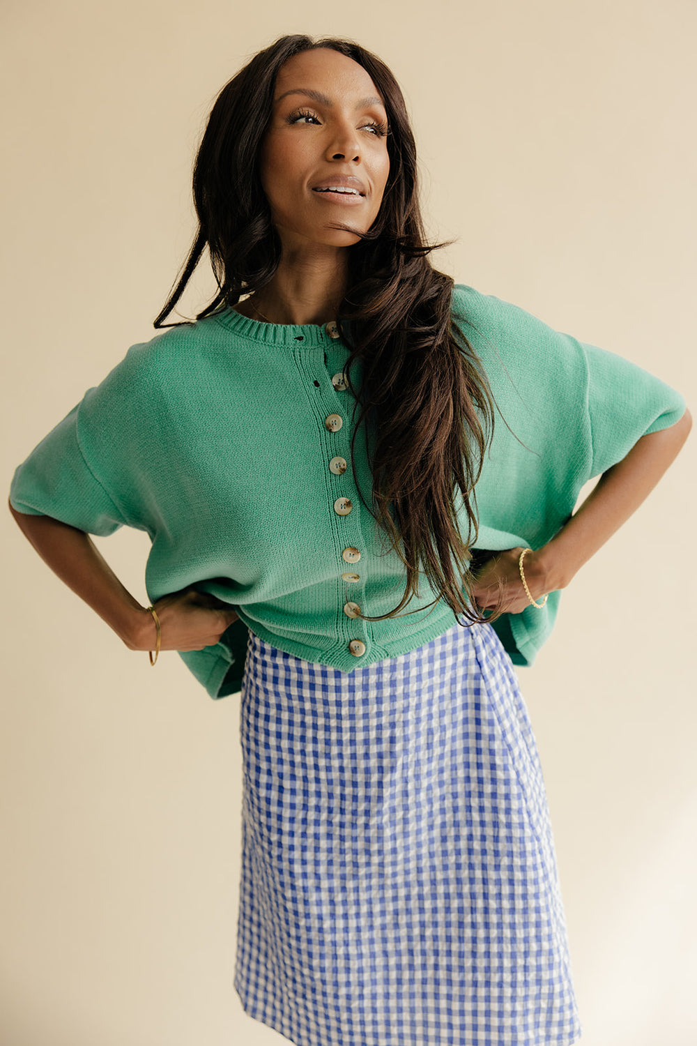 Bold yet wearable, this vibrant knit features a relaxed boxy fit and functional buttons for easy styling from season to season.