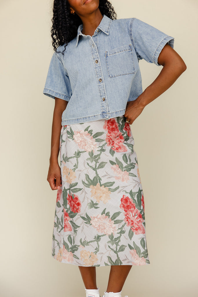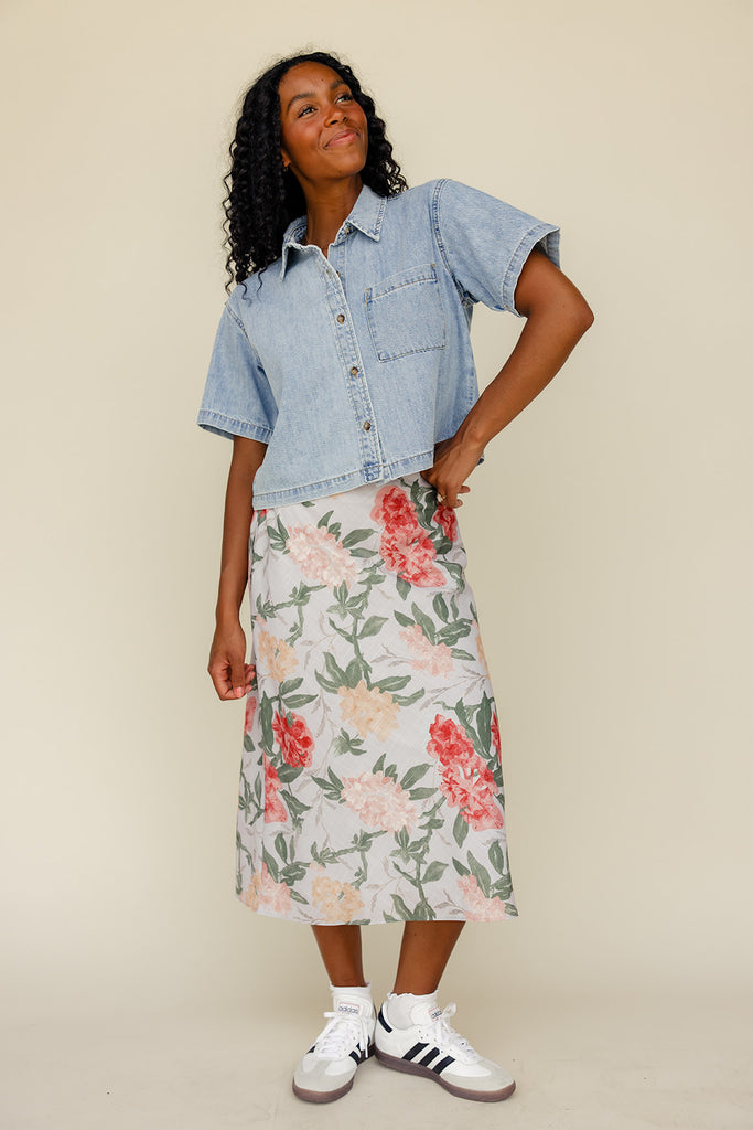 This blue floral midi skirt is soft, flowy, and perfect for warmer days. With its breezy silhouette and charming floral print, it’s an easy piece to dress up or down. Pair it with your favorite tee or a tucked-in blouse for an effortlessly pretty look.