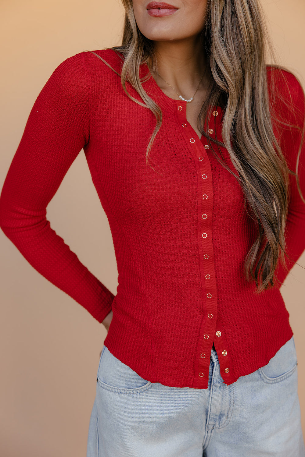 A bold pop of color for your everyday wardrobe. This cherry red cardigan from Free People features a flattering slim fit and soft ribbed knit — perfect for layering or wearing on its own.