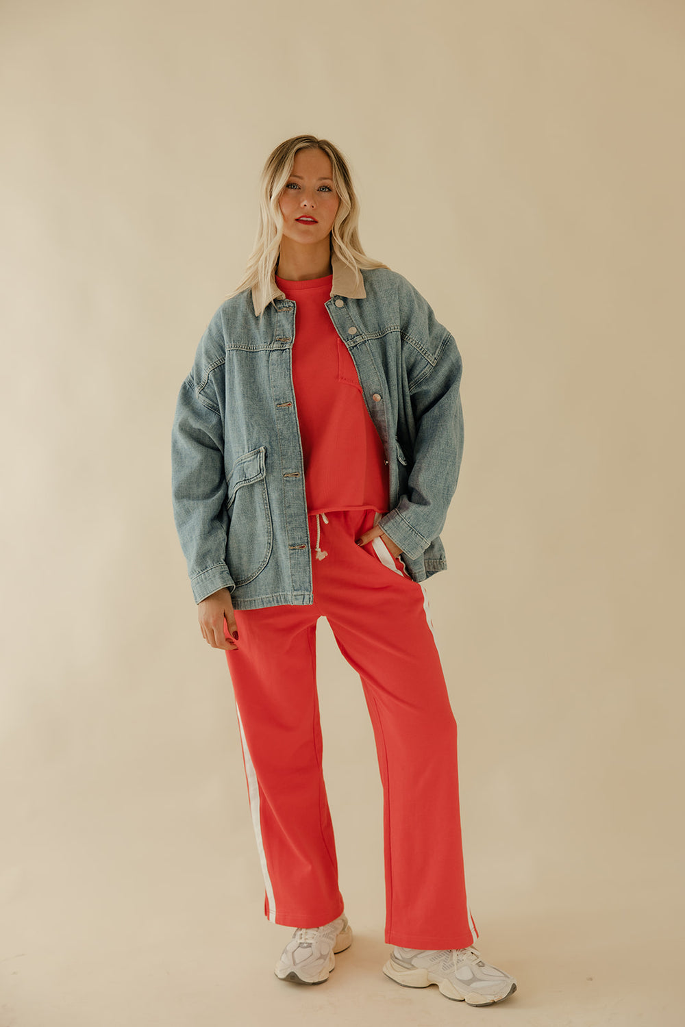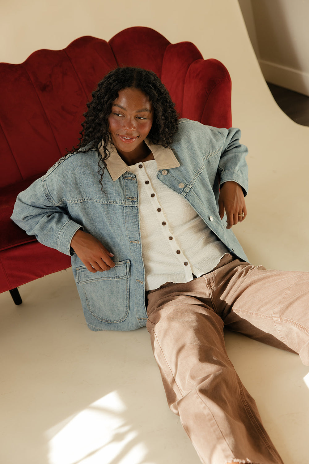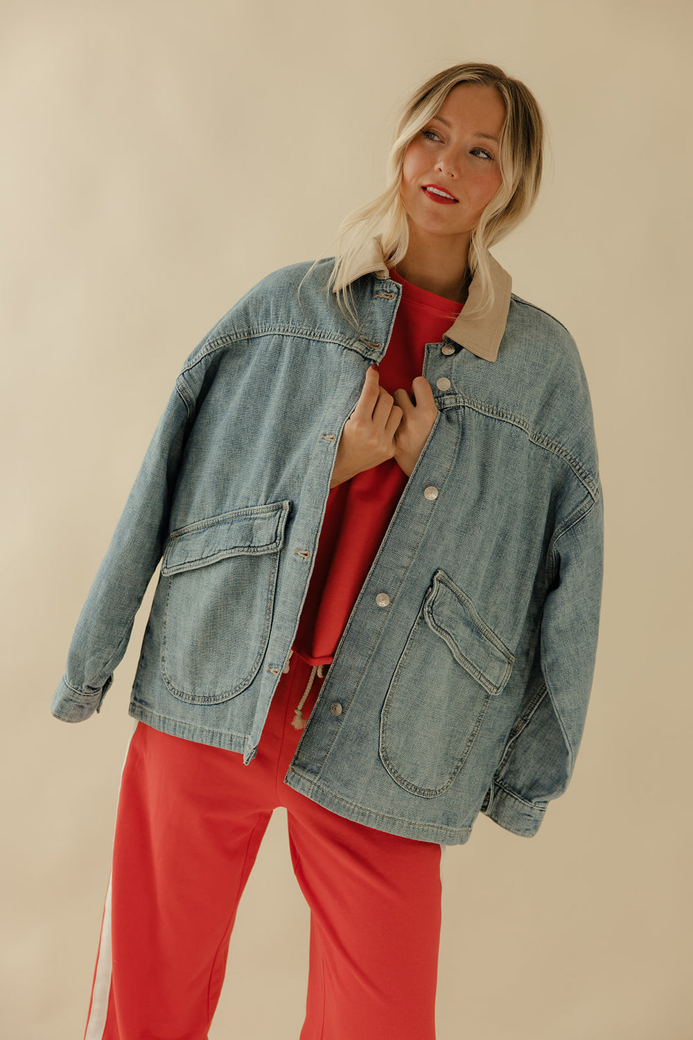 Perfectly oversized, this staple denim jacket features asymmetrical pockets and a contrasting canvas collar for subtle details that truly make the piece.