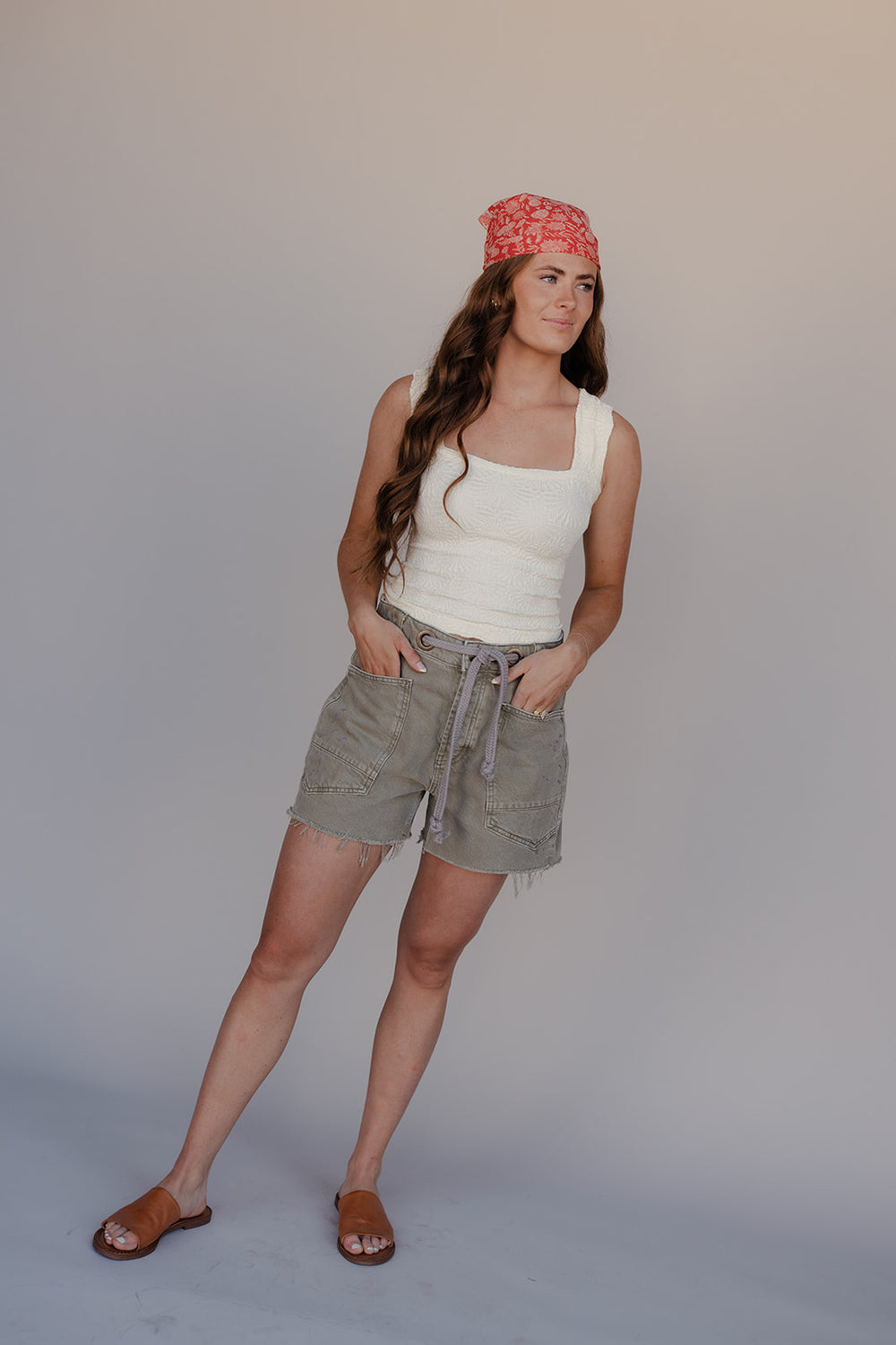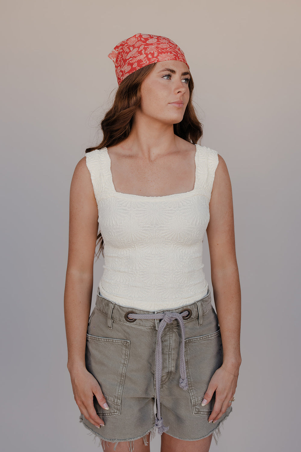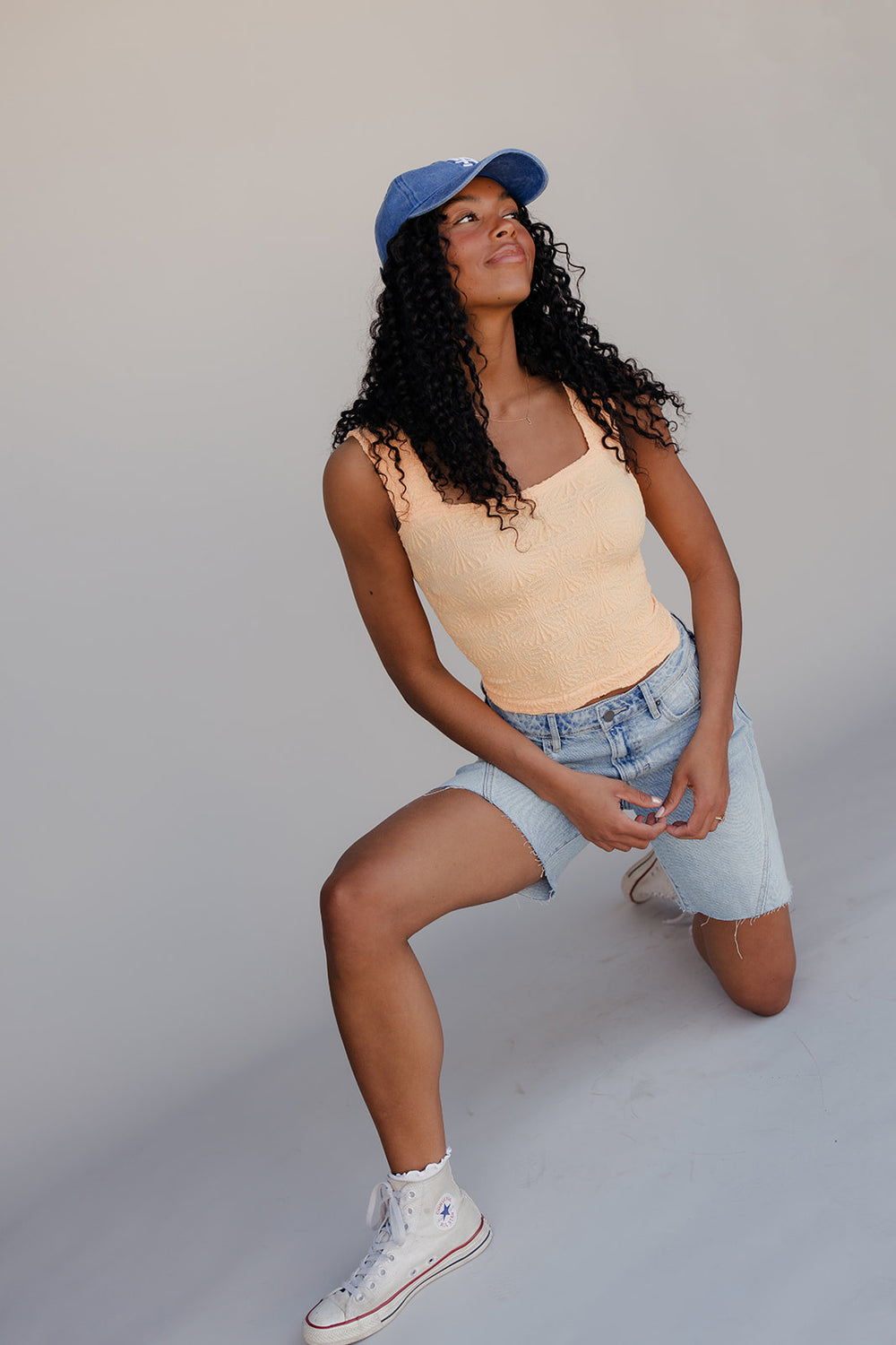 This cami is a love letter to you. It's square neckline and thick straps make it so flattering on any shape. Its floral texture and scalloped edges make it dainty and cute by itself or layered.