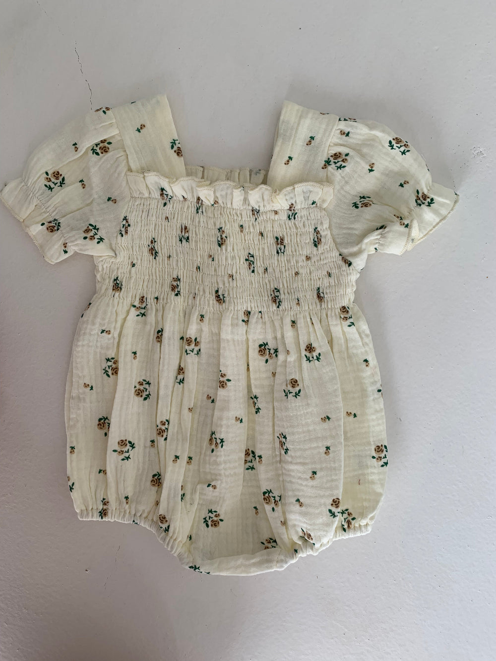 Look no further! This Garden Days ivory floral romper is perfect for your little one. Made from soft muslin fabric, it features muted brown florals and convenient snaps for easy diaper changes. Looking for a unique and chic look that won't go unnoticed? Get this romper and your child will shine!