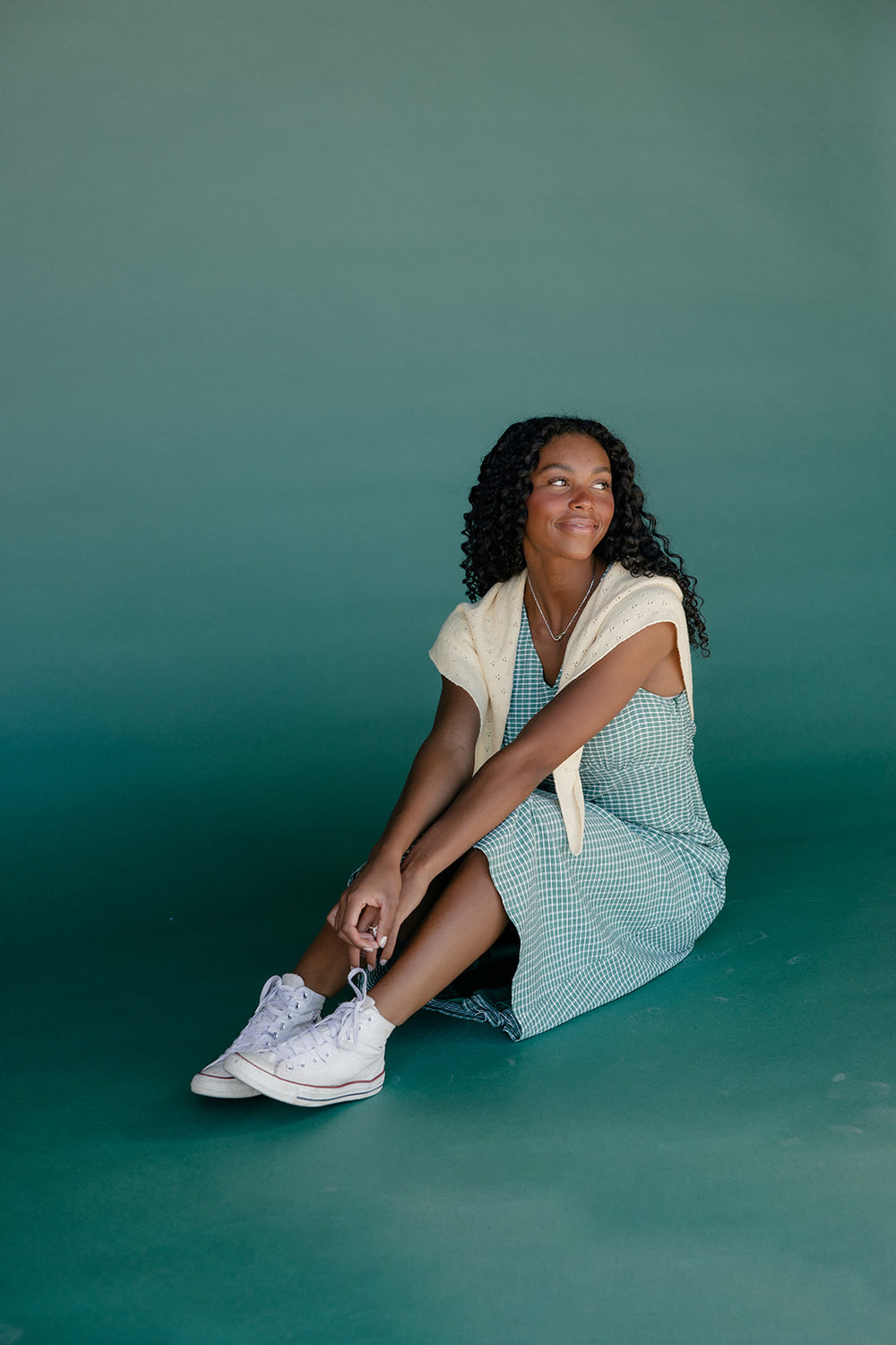 A breezy green gingham tank dress with a midi length and flattering A-line silhouette. Ideal for sunny days and easy layering.