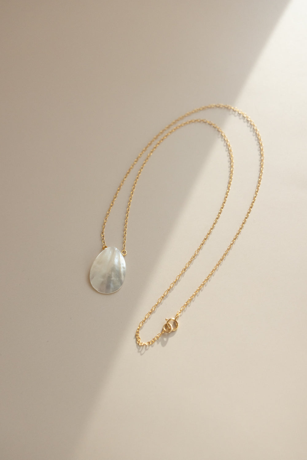 Handcrafted from gold filled chain, 5mm gold filled springring closure, gold filled pendant hardware, and mother-of-pearl shell droplet pendant.
