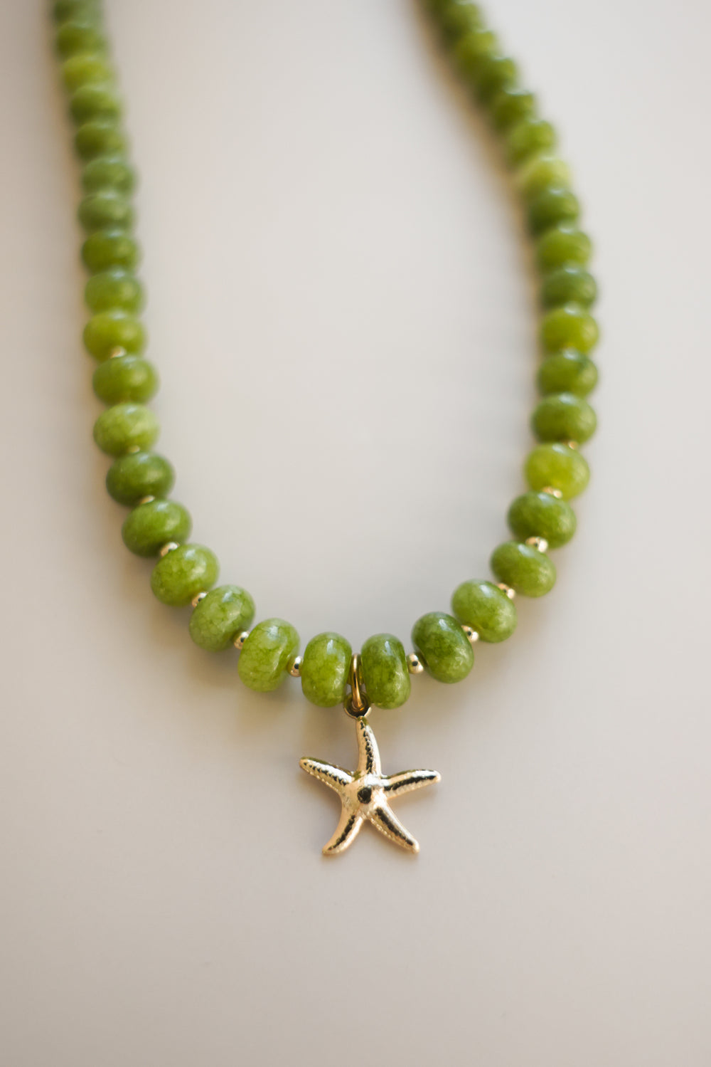 Handcrafted from 5x8mm genuine green jade rondelle gemstones, 2mm gold filled spacer beads, 5mm gold filled springring closure, and gold filled pewter starfish pendant.