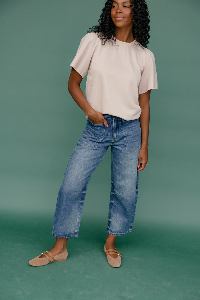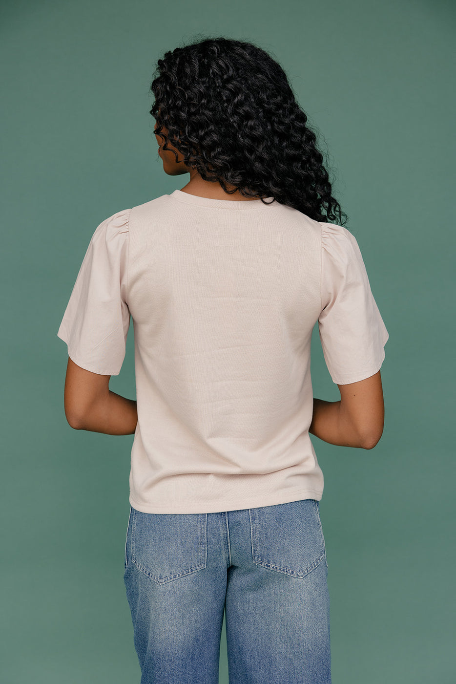 A+ in style. This light pink blouse features sweet flutter sleeves and a soft drape — perfect for those hall-to-home transitions.